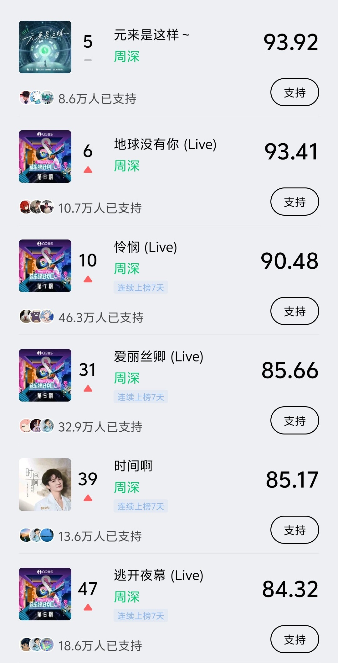 周深 📣 12.16 巅峰潮流 📣米米们晚上好,每歌做6个动作路径:Q音-乐馆-排行-潮流巅峰📍重点做新歌✅《元来是这样~》✅《地球没有你》📍其他top50✅《怜悯(live)》✅《爱丽丝卿(live)》✅《时间啊》✅《逃开夜幕(live)》完成『支持』让更多人听到深深