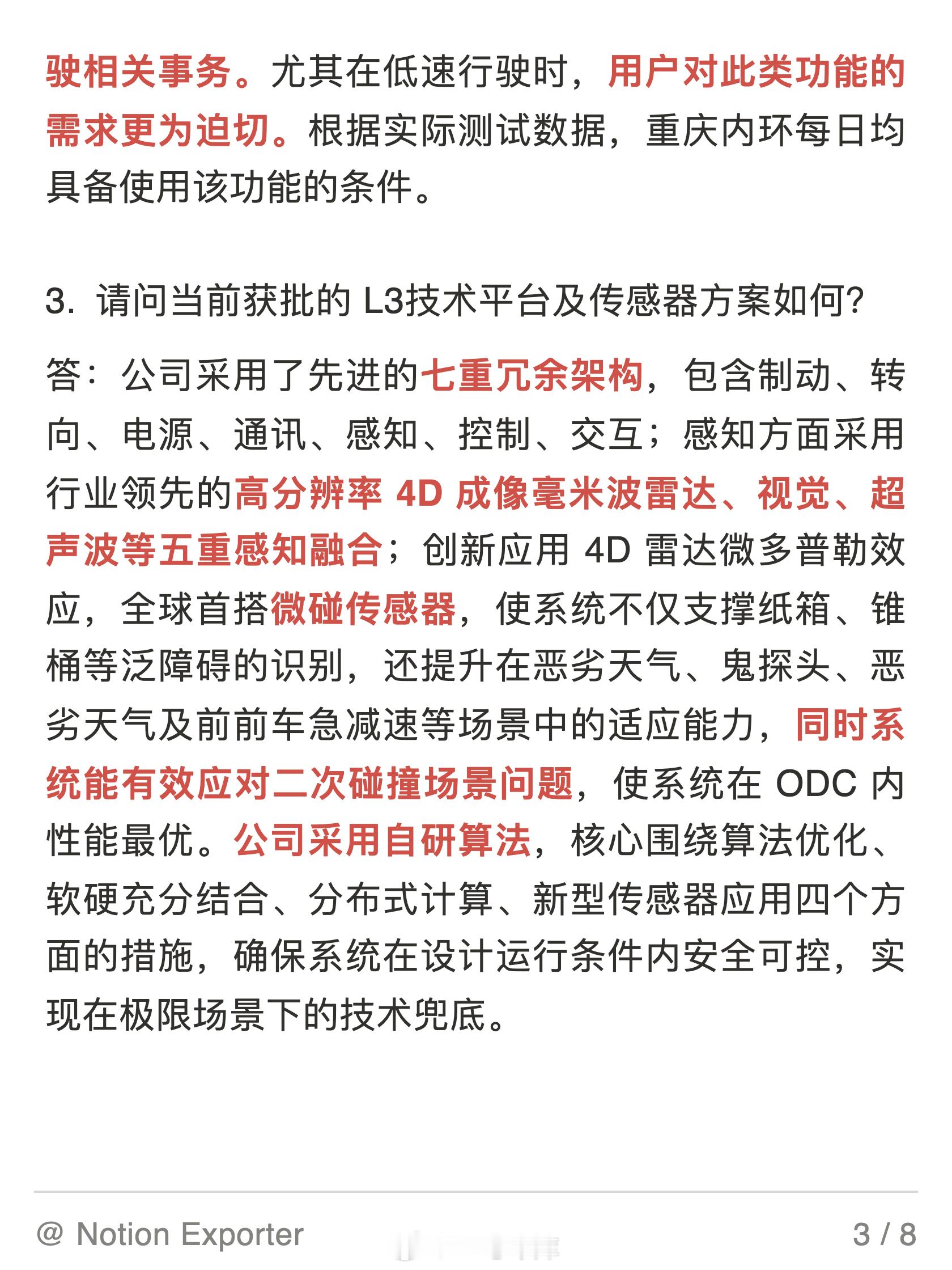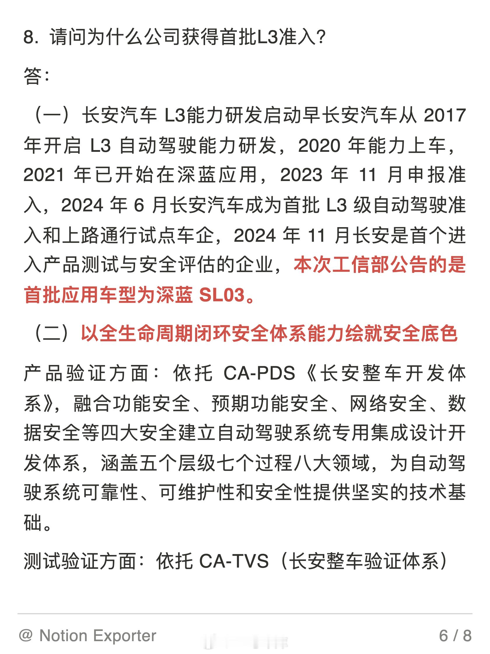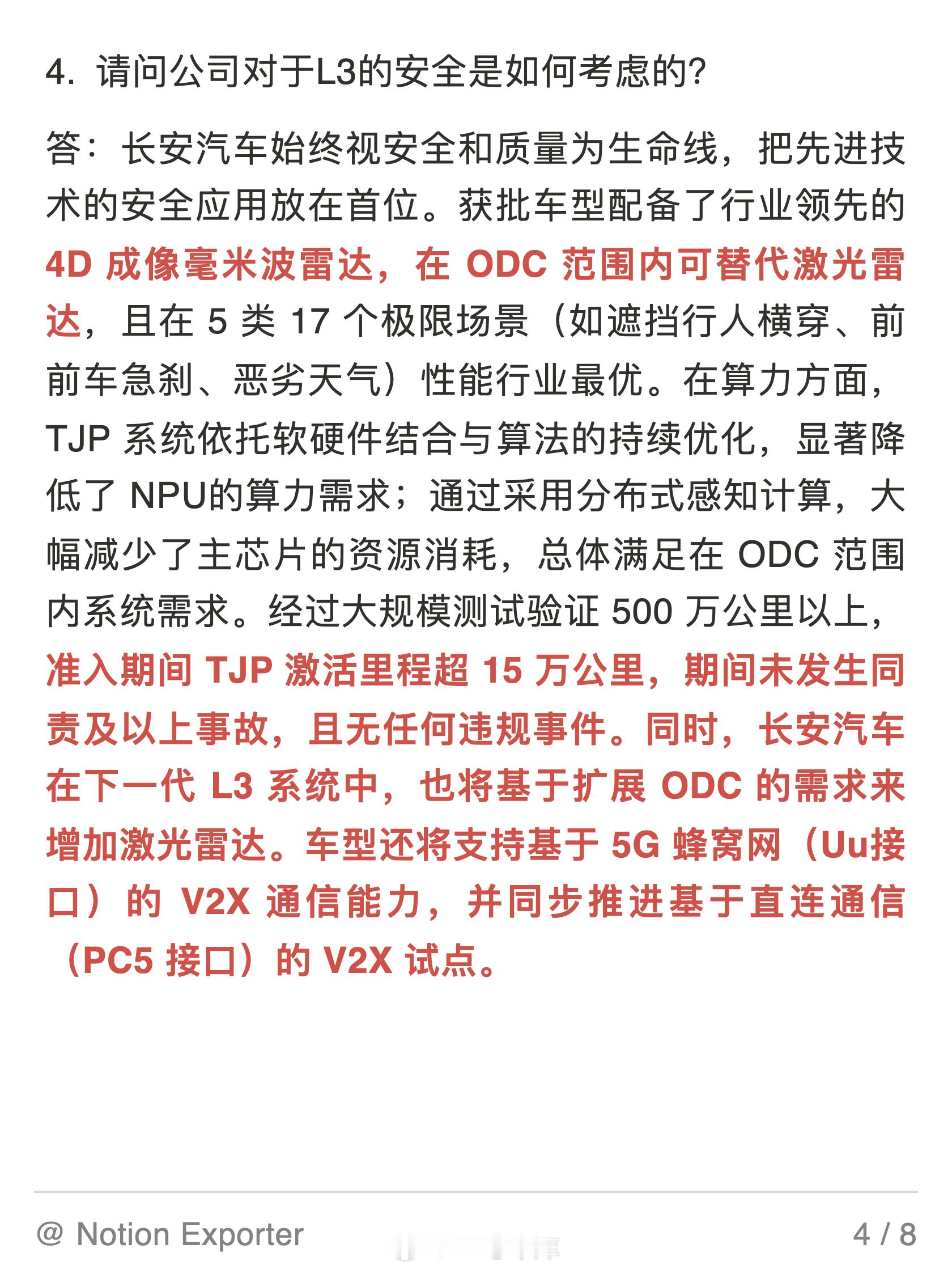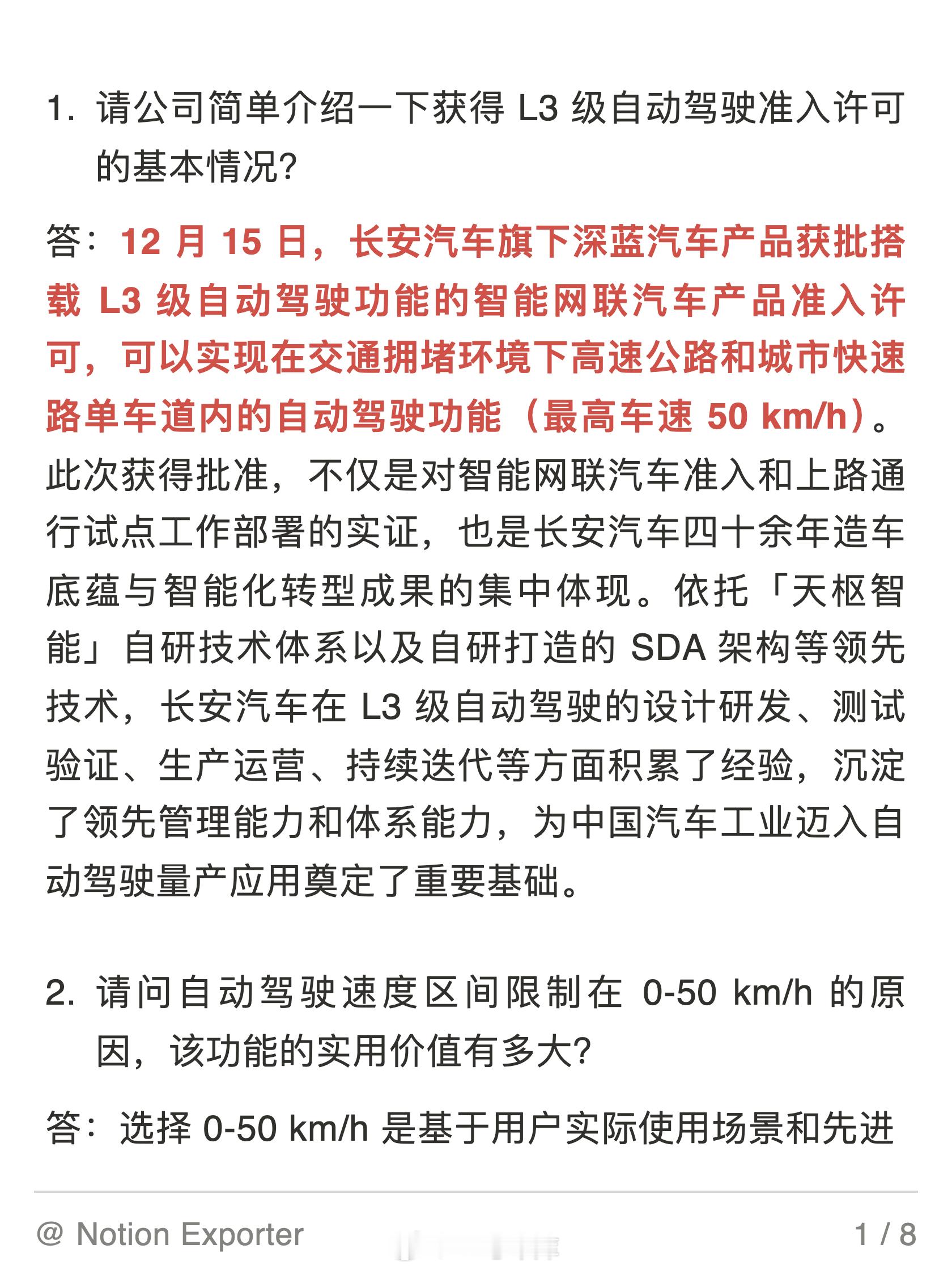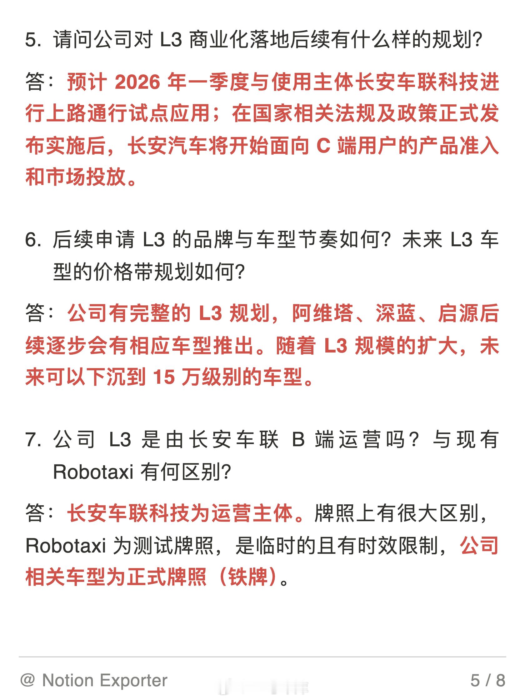 长安汽车接受特定对象调研,讲到了有关 L3 自动驾驶相当多的干货。8 张图是调研全文,以下是精华总结。L3 时代真的来了啊~- 长安的 L3 最高车速 50 km/h,真的实用吗?答:这个速度是基于已有的交通拥堵辅助(TJP)而来,TJP 的设计速度为 0 - 60km/h,L3 留出了 10 km/h 的安全余量。同时交通拥堵场景也是用户最大的痛点场景,驾驶负担重,用户对这个功能的需求更迫切。- 长安的 L3 用的什么传感器?答:七重冗余,包括 4D 毫米波雷达、视觉、超声波等无重感知融合(没有激光雷达)。4D 雷达有微碰传感器;同时能有效应对二次碰撞场景。算法为长安自研。- 长安对 L3 安全怎么考虑?答:经过大规模测试验证 500 万公里以上,准入期间 TJP 激活里程超 15 万公里,期间未发生同责及以上事故,且无任何违规事件。下一代 L3 系统中,将基于扩展 ODC 的需求来增加激光雷达。- L3 商业落地规划?答:预计 2026 年一季度与使用主体长安车联科技进行上路通行试点应用;在国家相关法规及政策正式发布实施后,长安汽车将开始面向 C 端用户的产品准入和市场投放。- L3 规划了哪些品牌和车型?答:阿维塔、深蓝、启源后续逐步会有相应车型推出。随着 L3 规模的扩大,未来可以下沉到 15 万级别的车型。- 长安的 L3 谁来运营,和 Robotaxi 有什么区别?答:长安车联科技为运营主体。Robotaxi 为测试牌照,是临时的且有时效限制,长安的 L3 为正式牌照(铁牌)。我国首批L3自动驾驶车型获准入许可新能源汽车42mark