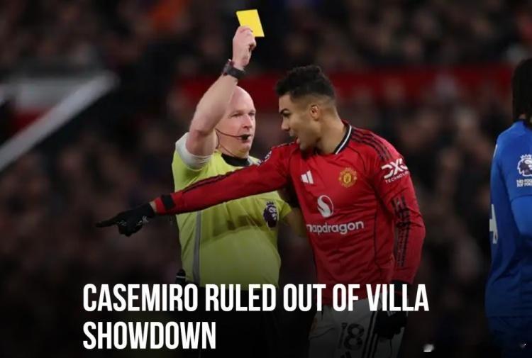 卡塞米罗联赛累计五张黄牌停赛,将缺战维拉,曼联官方确认,卡塞米罗因累计五张黄牌将缺席球队客战阿斯顿维拉的比赛。在曼联4-4战平伯恩茅斯的下半场,卡塞米罗绊倒了带球突入禁区的塔韦尼耶,这张黄牌也使得后者主罚任意球直接破门。这张黄牌是卡塞米罗本赛季英超领到的第五张黄牌,他也将缺席本月22日0点30曼联客战阿斯顿维拉的比赛。本赛季33岁的卡塞米罗代表曼联在联赛中出战15场比赛,贡献4球1助攻,他将在27日凌晨4点主场对阵纽卡的比赛中回归。