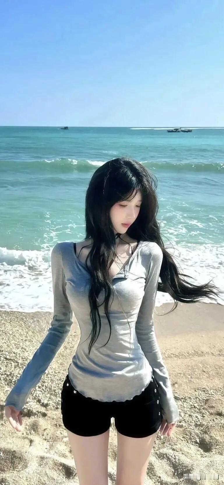 碧海蓝天卷浪纱,柔风漫拂鬓边霞。 素衣轻曳随潮走,黑袂微扬踏沙斜。 长发翩跹逐海韵,眸光凝睇念芳华。 此间风物皆成画,一刹心动寄天涯。