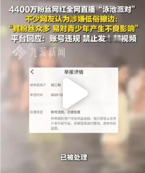 4400万粉丝网红直播泳池派对被处理。 看到这条信息直接在问,什么是网红,这些网红都是谁捧的。 现实生活中经常看到有些人自称是大网红,总是在挑战一些特权的底线。并加以各种违背人品的威胁。 所谓的网红,在老百姓眼里,认可你的才是网红。不认可你的还是知趣一点,做个普通人吧。 有些人一旦做了网红,做人做事就有点过分的漂了。像这位4400万粉丝的网红,你创作什么素材不好,非要搞游泳池直播派对。如果是博流量,你的粉丝群摆在这里也够了。如果是博眼球,也完全没有必要这么挑战平台规则。如果是为了创收益,自媒体平台的水大家喝,你一个人是赚不完那么多钱的。 众多老百姓捧着你,你合法的网红不做,非要扰乱社会治安。严肃处理你,你活该。