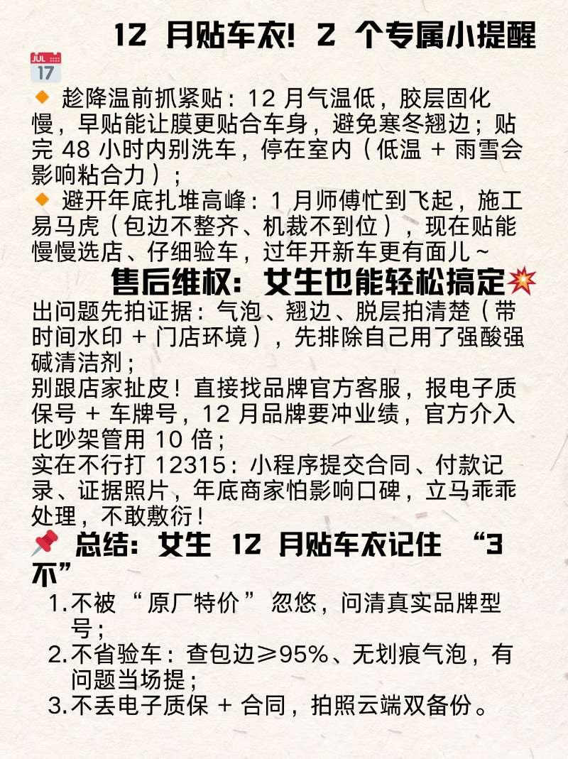年底贴车衣必看!女生专属避坑攻略,12 月不花冤枉钱话虽直但真的为你好!12 月贴车衣怕被宰、怕售后扯皮,这份女生专属攻略,帮你少花几万冤枉钱~【来自懂车帝车友圈】