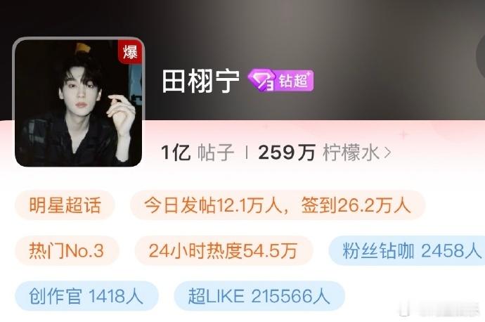 田栩宁超Like破25万了田栩宁超话超like破25w田栩宁超Like破25万了,咱就说我们阿栩的人气真的很高啊,期待住你多多分享你的日常,我们爱看呢,期待住下次再见啦~