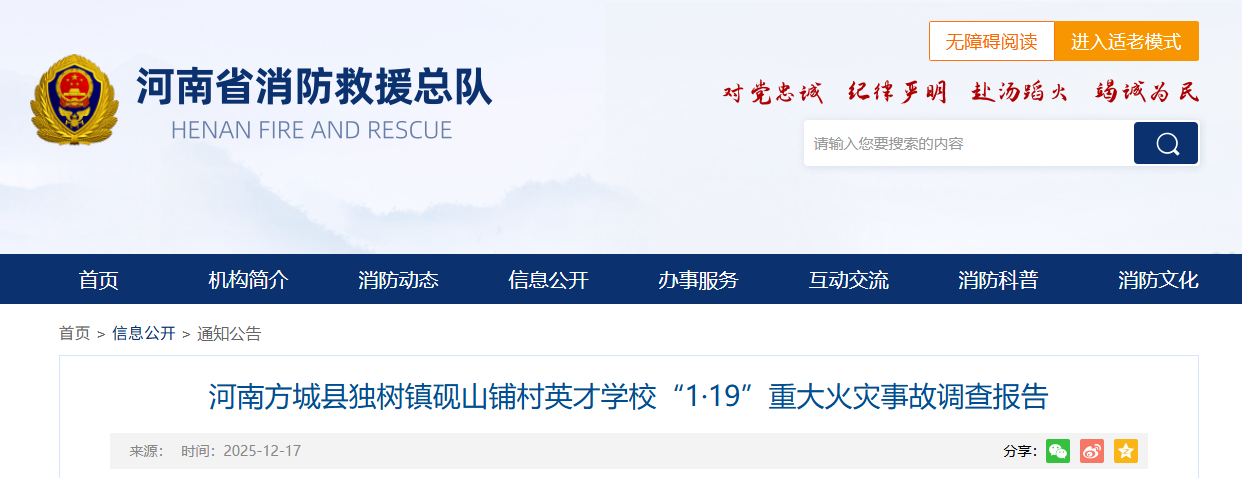 【#河南对外发布方城英才学校重大火灾事故调查报告# 25名责任人员被处理处分】据央视新闻消息,12月17日,河南省发布方城县英才学校重大火灾事故调查报告。经调查认定,该起事故系起火宿舍内一名小学生使用打火机时,引燃宿舍衣服、床铺等物品并迅速蔓延造成的重大火灾。记者从有关部门获悉,河南省纪检监察机关依规依纪依法对履行职责不力、监督管理不到位的25名责任人员作出严肃处理处分。2024年1月19日23时许,南阳市方城县独树镇砚山铺村英才学校一宿舍发生火灾,造成13人遇难、4人受伤。事故发生后,河南省政府牵头成立火灾事故调查组,经现场勘验、调查询问、检验鉴定、视频分析、模拟实验等方式,对起火原因进行了深入调查。此外,调查组还认定了事故性质和责任,提出了对有关责任人、责任单位的处理建议和加强事故防范工作的措施建议。报告显示:公安机关已对5人采取刑事强制措施。建议对25名人员给予党纪政务处分。吊销英才学校办学许可证并进行处罚。据了解,涉事校方李某、徐某、贾某涉教育设施重大安全事故罪一案将于近期开庭审理。