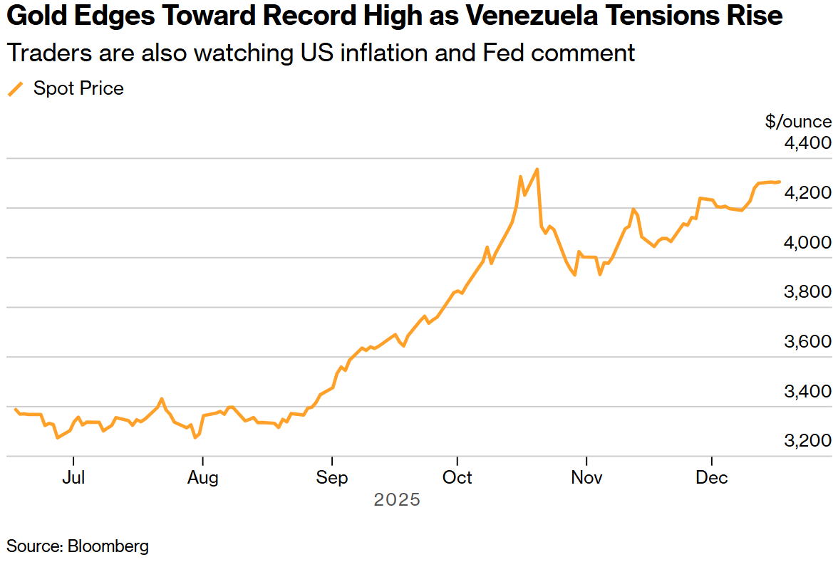 随着投资者关注美国通胀数据并监测委内瑞拉不断升级的紧张局势,黄金价格逼近历史新高。白银则攀升至新的峰值,延续了强劲的涨势。