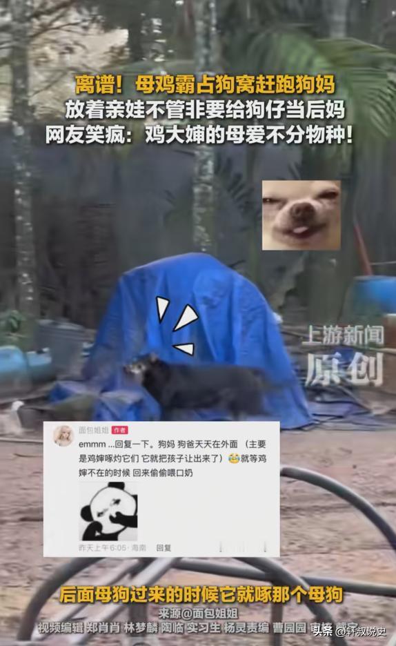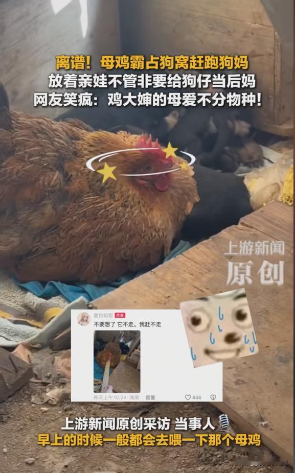 “太离谱了!”12月8日报道,海南一女子喂鸡时,发现有只母鸡将狗妈妈赶走,霸占着它的狗窝,放着自己的亲娃不管,非要在狗窝里面“孵小狗”,旁边狗妈妈怕母鸡啄它,根本不敢过去,只能在边上急得团团转。[尬笑] 在海南澄迈一户人家发生了件有意思的事,一只母鸡扔下自己刚孵出的小鸡,转身挤进了隔壁的狗窝,它把刚生产完的狗妈妈赶走,自己趴在窝里,一本正经地“孵”起了那窝小狗。 那么母鸡为何会这样?这并非它多有“爱心”或真的眼拙,根本原因在于它体内急剧变化的激素,当母鸡进入孵卵期,雌激素水平飙升会强烈触发其筑巢、护崽的本能。 任何符合“需要庇护的幼崽”特征的对象——比如毛茸茸、行动缓的小狗,都可能启动它的母性程序,而那个柔软温暖的狗窝,在它看来就是个现成的完美育婴所。 相比之下它自己孵出的小鸡已经能跑能跳,对它的依赖降低,而这窝动弹不得、嗷嗷待哺的小狗,反而更能持续激发它强烈的保护欲,至于狗妈妈的退让,则是因为母鸡的攻击性有限,在狗妈妈看来,这更像是“低威胁骚扰”,它担心激烈反击会不小心伤到自己的宝宝,于是选择了隐忍。 这种现象也折射出鸟类母性本能的一些特点,只要幼鸟在巢里,它就认为是自己的后代,自然界著名的“巢寄生”现象,比如杜鹃把蛋生在其他鸟的巢里,也说明部分鸟类对后代的识别并不总是精确的。 这起发生在海南澄迈的“母鸡霸占狗窝孵小狗”的趣闻,在网络上迅速引起了热议,网友们的评论也是五花八门,特别有梗。 “建议狗妈直接报警,理由是非法入侵住宅和拐带幼崽!” 这其实是母鸡强大的母性本能“错位”激发了,母鸡进入‘抱窝’阶段后,激素水平变化会让它看啥都像自己的蛋,毛茸茸、不太能动的小狗正好符合它心里‘需要温暖的小宝宝’形象。 “小狗更需要保护,它自己那些能跑能跳的小鸡反倒激发不起它的照顾欲了,狗妈妈不敢硬来,是怕动手时伤到自己的孩子,只能忍气吞声。” “这不稀奇,以前我家母鸡还帮邻居家的鸭子孵过蛋,最后带着一群小鸭‘招摇过市’,根本没发现孩子不是亲生的。” “我家以前也发生过!那只母鸡特别凶,吓得狗妈妈只敢趁它去吃饭的几分钟,狂奔回窝快速喂几口奶,跟做贼一样。” “我家猫妈妈曾经难产走了,留下三只小奶猫,结果家里一只刚下完蛋的母鸡居然跑去抱着小猫取暖,最后小猫是吃羊奶长大的,但晚上一定要挤在母鸡肚子下面才肯睡觉,万物真有灵性。” “看来‘鸡飞狗跳’这个词不准确啊,现实版是‘鸡占狗巢’,和谐共处!” 如果你是这个家的主人,你会选择把母鸡抱走,物归原主,还是顺其自然,让这位“鸡妈妈”继续照顾小狗一段时间呢?或者,你在生活中有没有遇到过类似动物之间这种意想不到的温情故事?欢迎在评论区分享你的看法和经历! 信息来源:《离谱!母鸡霸占狗窝赶跑狗妈放着亲娃不管非要给狗仔当后妈网友笑疯:鸡大婶的母爱不分物种!》上游新闻