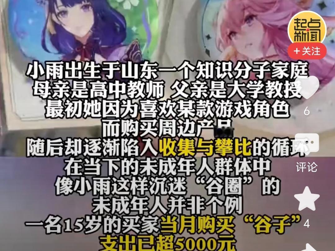 山东女孩掐母亲脖子要钱,失控的“谷圈”消费,毁掉了多少孩子? 山东15岁女孩谷雨在家聚餐时,因为妈妈不给她钱买游戏角色的周边,突然情绪崩溃,竟伸手掐住妈妈的脖子哭喊:“这次错过了就没有了,凭什么不给钱?” 谷雨本来家庭条件不错,父母都是老师,她自己成绩也好,考上了重点高中。但自从迷上一款游戏角色,她渐渐陷了进去,从简单买周边发展到不断在二手平台抢购、和别人攀比收藏,甚至想用“谷子”铺满房间。 她每个月都要问家里拿一两千块钱买这些,整天只顾刷手机看交易信息,学习成绩一落千丈,后来干脆休学在家,和家人关系也越来越差。 这次动手之后,她躺在床上说自己有抑郁症和躁狂症,反复念叨着机会只有一次。原本好好的孩子,就这样被一个爱好拖向了失控的边缘。 “谷圈”是什么? 简单说,“谷子”就是英文“Goods”(商品)的音译,指的是动画、漫画、游戏等作品的周边产品。 而购买这些商品的行为叫做“吃谷”,爱好者们聚集形成的圈子就是“谷圈”。 这些周边产品包括徽章、卡片、亚克力摆件等,价格从几十元到数千元不等。 在圈内还有自己的黑话:“官谷”指官方出品;“海景房”形容特别值钱的好谷子;“痛包”则是用谷子装饰的包包。 谷雨事件不仅是家庭的危机,更是社会的一面镜子。 从家庭教育层面来看,问题远不止孩子不懂事。 像谷雨这样的孩子,买那些动漫周边,很多时候不是真想要那个东西,而是心里有压力、觉得孤独,或者在学习、交朋友上受了挫。 家长只看到乱花钱、不务正业,一上来就骂或直接不给钱,根本没有了解孩子背后的原因。 这样反而会把孩子更猛地推向那个能给他即时满足和认同感的圈子里。 家长要先搞明白,孩子到底在躲什么现实问题,为什么寄情于这种没有任何意义的物件。 另外就是外面的世界套路太深,商业诱惑太猛,最后坑了孩子。 这个“谷圈”市场,充满了商家设计的套路:什么限量、绝版,就是故意制造紧张感,让你觉得不买就再也没了。 更别说二手市场炒到天价,还有各种诈骗陷阱。 一个没社会经验、爱冲动的孩子,掉进这种环境里,光靠孩子自己自觉是扛不住的。 引导孩子正确的价值观,消费观,也是家长非常必要的功课。 所以,解决这事不能只怪孩子。 家里得学会听懂孩子的求救信号,给真心的陪伴和引导;而那些平台和商家,也不能只顾赚钱,得给未成年人设置真正的保护线。 朋友们,你们怎么看待这件事?
