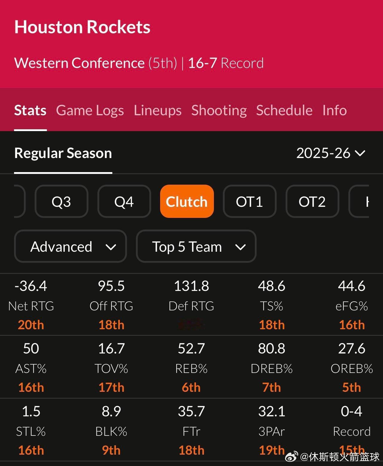 在对阵前五名球队(雷霆、活塞、掘金等,0胜4负)时,火箭队在关键时刻的攻防执行均表现挣:▪️ 进攻效率仅95▪️防守效率高达131▪️ 失误数多于助攻数▪️罚球命中率65%▪️ 真实命中率49%值得关注的是,火箭队在这4场对阵前五名球队的比赛中,累计经历了34分钟的关键时刻争夺,除了其中1分钟外,所有最后5分钟(共4场)和加时赛(共3节)时间都处于5分分差以内。休斯顿火箭nba常规赛休斯顿火箭
