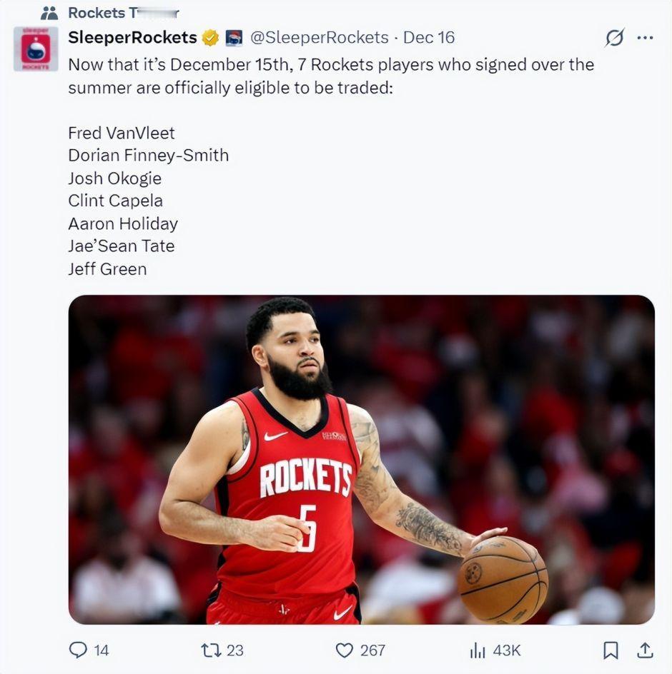 火箭虽然因为范弗利特的受伤获得了一笔1250万的伤病特例 但是由于其距离第一土豪线只有125万的距离,所以无法通过签约和认领这种方式 唯一的方式就是交易 而火箭夏天签下(续约)的7名球员如今都已经解封可以交易 若是希望简单修修补补,泰特、老格林、霍老三可能被交易 若是希望交易获得一名轮换级别的即战力,那伊森、谢泼德、卡佩拉、奥科吉、DFS都可能被纳入交易中去 如果火箭野心够大,想要拿下字母哥或者戴维斯,那范弗利特、小贾、申京都可能被拿去交易。