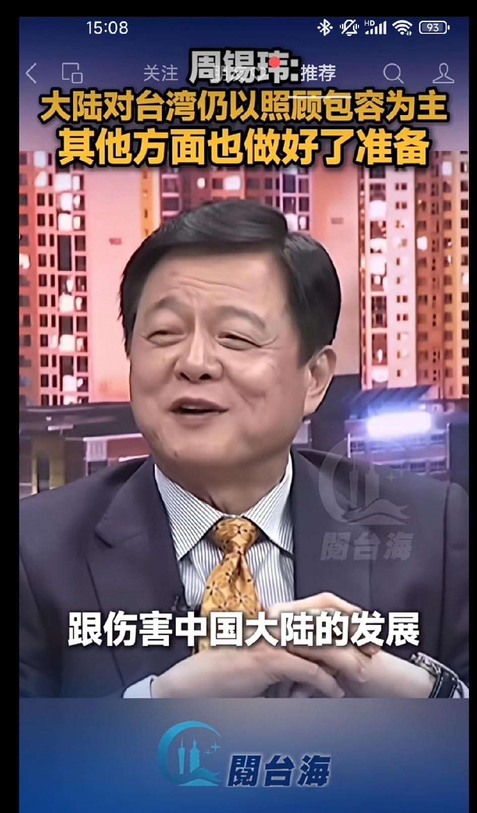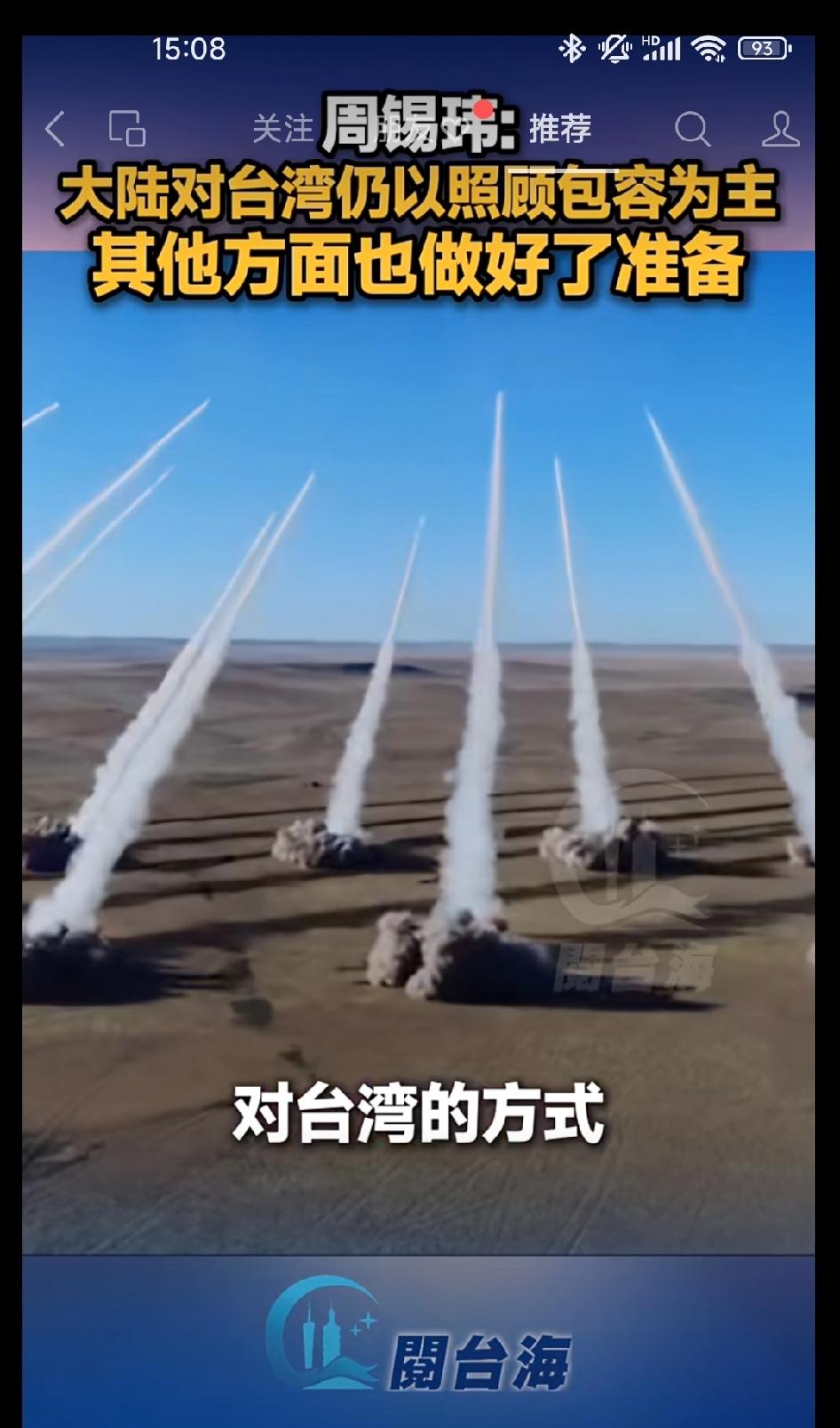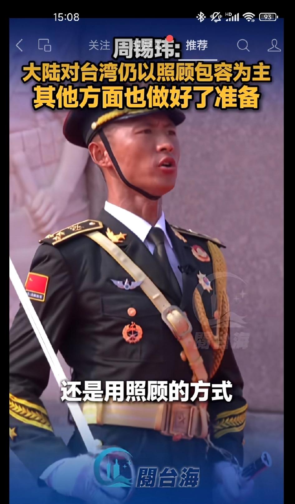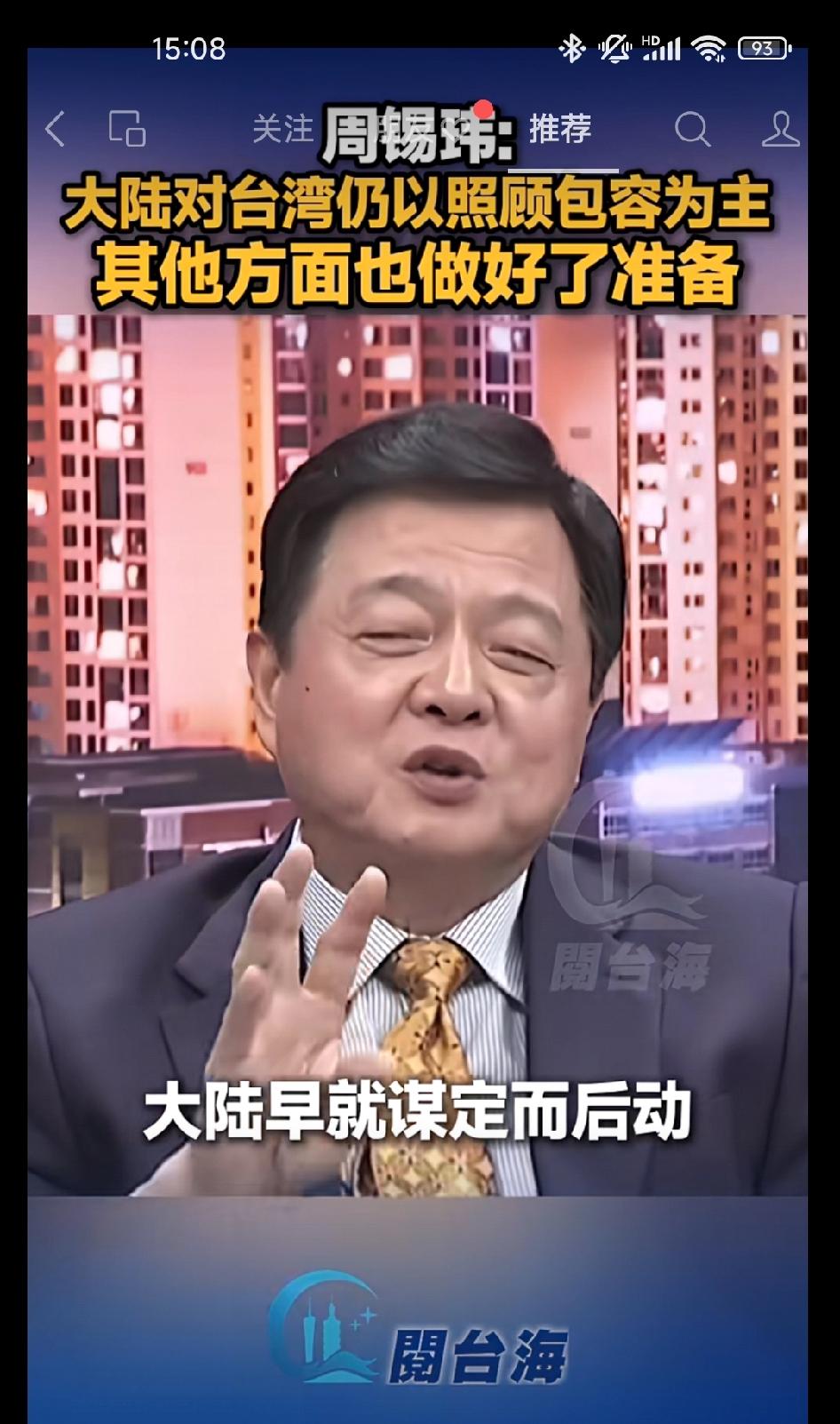 周锡玮:大陆对台湾仍以包容的态度,但一切都已做好了准备! 台湾的问题根本就是美国要拿来制衡中国的工具。 大陆是“和统”不行就“武统”,我给你机会,你不要就算了。 大陆对台湾的方式还是用照顾的方式,包容的方式,但不要认为这是大陆心软,这只是大陆方方面面都已经准备好了,全部按照他自己的棋去走而已。 大陆早就谋定而后动!