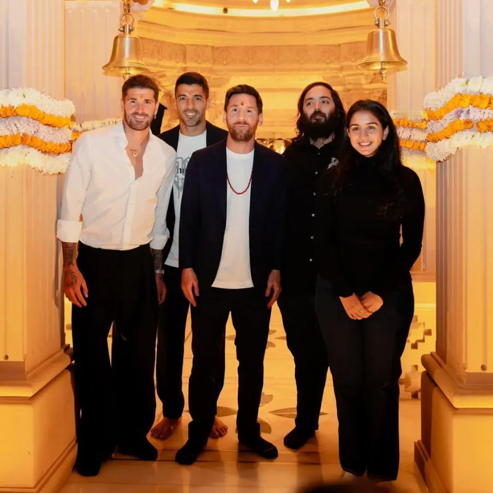12月16日,足球巨星梅西在印尼受到了印度首富300斤儿子的款待。 梅西和两名伙伴——迈阿密国际队的队友路易斯·苏亚雷斯和罗德里戈·德保罗,一起来到了首富公子安巴尼的豪宅,还参加了印度传统的祈福仪式。 安巴尼热情拥抱了梅西,两人就像好友一样,对于一向深居简出的首富公子,安巴尼这一次显得很是热情。 梅西穿着西装,内搭圆领白T,尽显成熟魅力。手上戴着的理查德·米勒限量款,价格约为120万美元,也很是贵气。 一身帅气穿着,梅西参加祈福仪式,额头还点上了红色吉祥痣,有点儿可可爱爱!