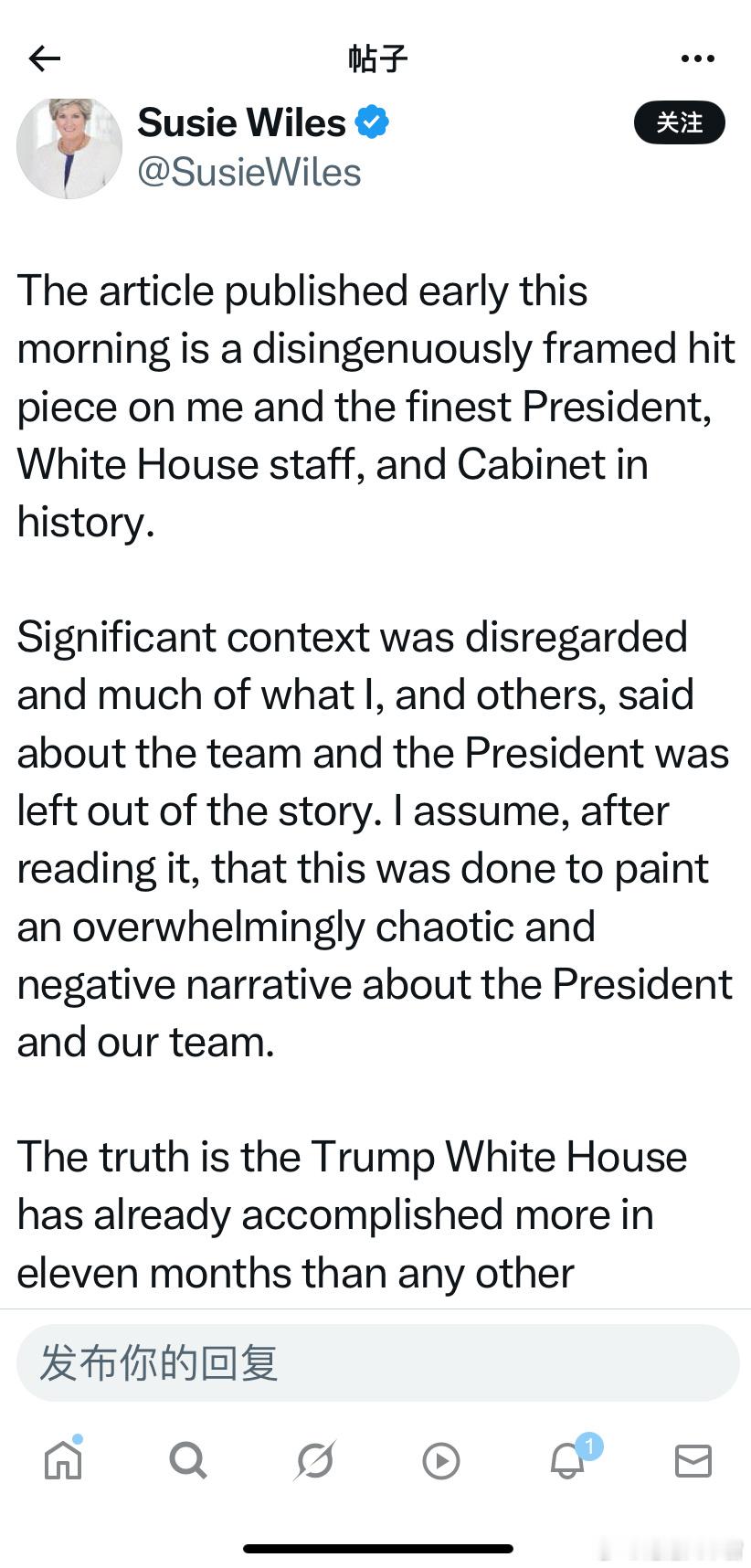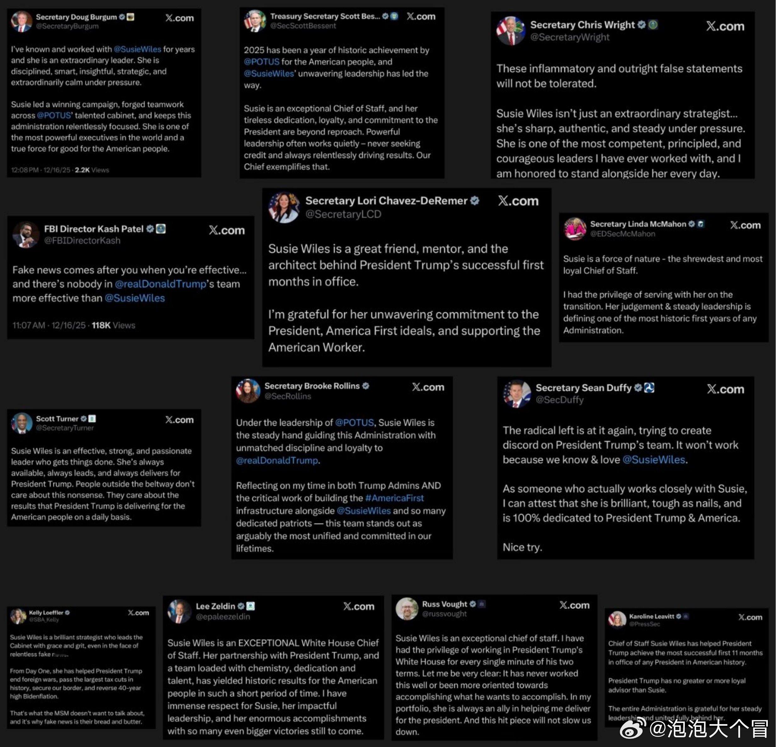 2025年12月16日,《Vanity Fair》杂志发表两部分报道,基于白宫幕僚长Susie Wiles在特朗普第二任期第一年内与作者Chris Whipple进行的11次访谈。报道称,Wiles在访谈中提到:- 特朗普虽不饮酒,但具有“an alcoholic’s personality”(酗酒者个性),因为他认为“there’s nothing he can’t do”(无所不能),并将其与自己酗酒的父亲相比。- 特朗普的部分行动受“retribution”(报复)驱动,她曾与他达成“loose agreement”(松散协议),希望在90天内结束“score settling”(算旧账),但未完全实现。- 在Epstein文件上,特朗普指控克林顿多次访问Epstein岛屿“was wrong”(错误),她表示“there is no evidence”(无证据)。- 对团队成员的评价:称副总统JD Vance曾是“conspiracy theorist”(阴谋论者);司法部长Pam Bondi在处理Epstein文件时“completely whiffed”(完全失误);其他涉及Elon Musk、Russell Vought等。报道发表后,SussieWiles罕见在在X上发帖称文章为“disingenuously framed hit piece”(不诚实构陷的攻击文章),指遗漏重要上下文和正面内容。特朗普接受《纽约邮报》采访,表示未读文章,但称Wiles“done a fantastic job”(做得非常出色),并同意自己有类似个性。白宫新闻秘书Karoline Leavitt声明,特朗普“has no greater or more loyal advisor than Susie”(最忠诚顾问),整个政府支持她。副总统JD Vance、预算主任Russell Vought等多位官员公开力挺Wiles,强调团队团结,并在X上发帖回应。事件引发媒体广泛报道,白宫迅速回应显示内部一致。评:断章取义,移花接木的手法向来是左派媒体的传统技艺,这次为了攻击川普团队,终于轮到了处事低调的Sussie Wiles,更有媒体添油加醋称她是建制派绊倒川普的重要支点!今天突然出现的舆论节奏,各位博友应该豪不陌生,我反而认为这是个好兆头,因为当对手只有骂娘造谣和撒泼的时候,那他们一定是理屈词穷了。海外新鲜事海外新鲜事民主党丧心病狂左派是人类文明之癌