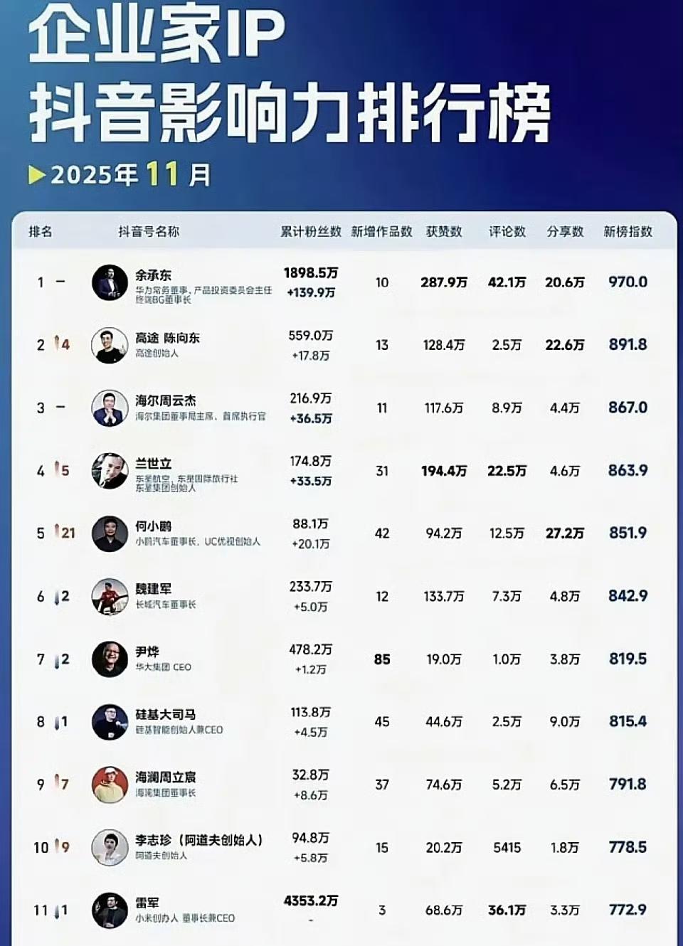 企业家IP这条赛道,抖音影响力排行榜第一名已是余承东。要我说:余承东用真技术和真