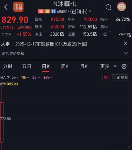 今天沐曦股份登陆科创板,成为继摩尔线程后又一家上市的国产GPU龙头。沐曦股份以700元/股开盘,收盘上涨693%,超越摩尔线程跻身A股股价第三位,仅次于贵州茅台和寒武纪,沐曦股份总市值突破3300亿.沐曦算是国内高性能通用GPU领军企业,产品覆盖AI训练推理、通用计算及图形渲染三大领域,曦云C500系列芯片贡献97%营收,性能对标英伟达A100;曦云C600系列已经实现设计到封测全流程国产化,性能据说介于英伟达A100-H100之间,计划2026年量产,下一代C700系列的目标是对标英伟达H100,而且自研的MXMACA软件栈兼容国际主流生态,适配大规模集群训练。2025年前三季度沐曦的营收是12.36亿元,最近三年营收复合增长率超4000%,在手订单14.3亿元,客户包括头部互联网企业及省级算力集群。沐曦股份上市首日涨693%