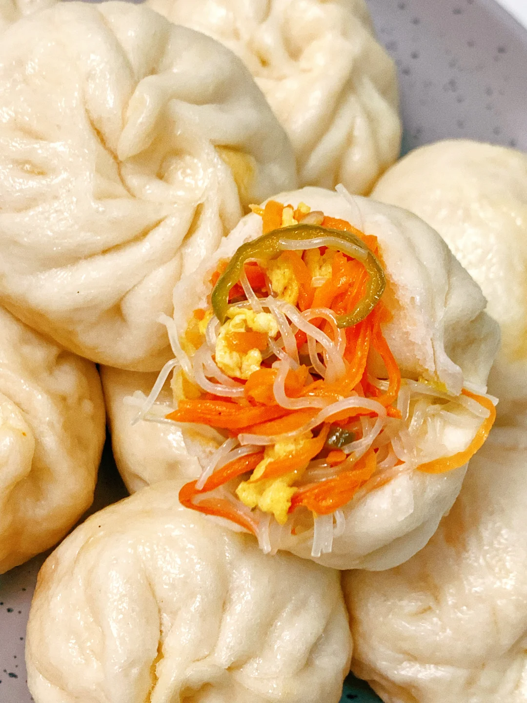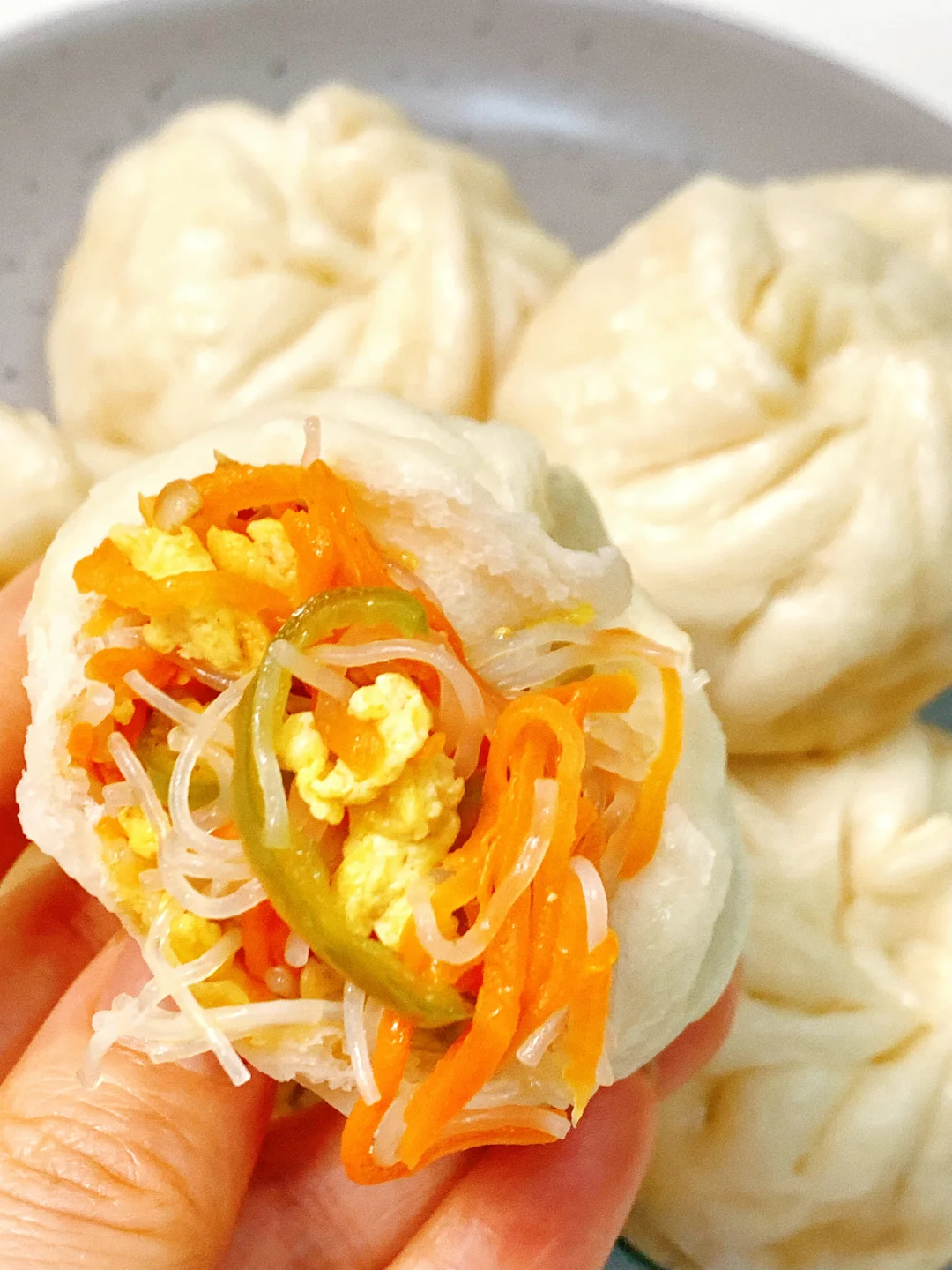 馅料:胡萝卜,鸡蛋2个,粉丝,青椒🫑,葱花,蚝油,白糖,盐,五香粉,香油