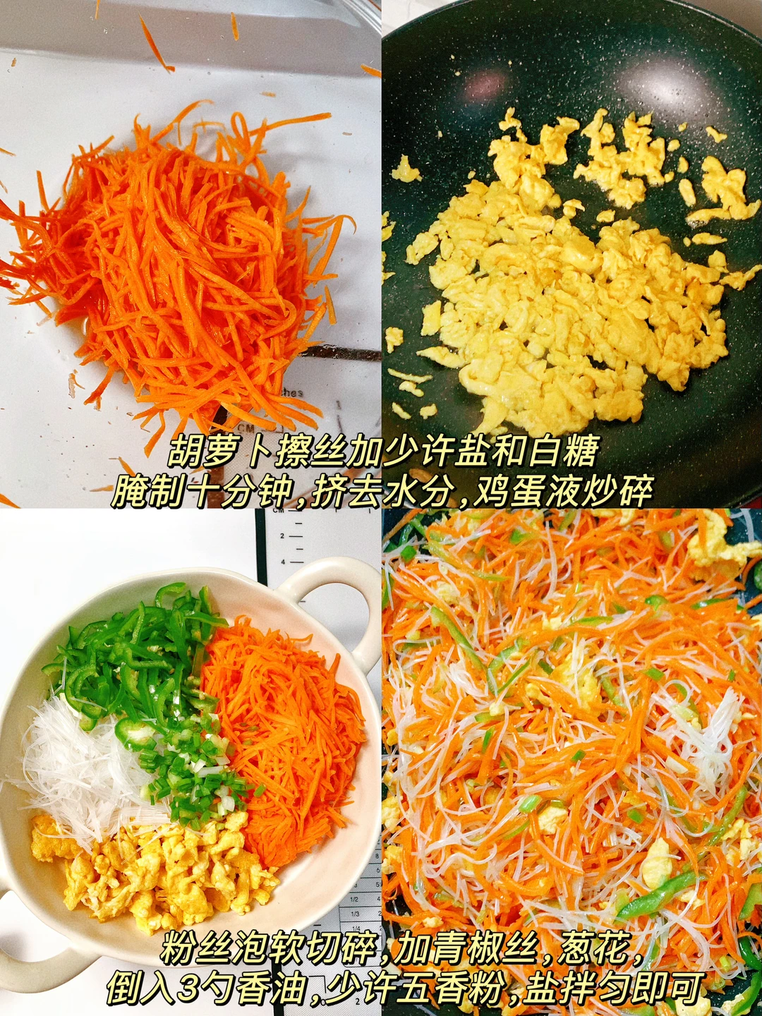 ✅胡萝卜丝加少许白糖,盐腌制十分钟,挤干水分,鸡蛋炒熟,粉丝泡软(喜欢软一点的用温水泡软后,开水烫一下,切碎