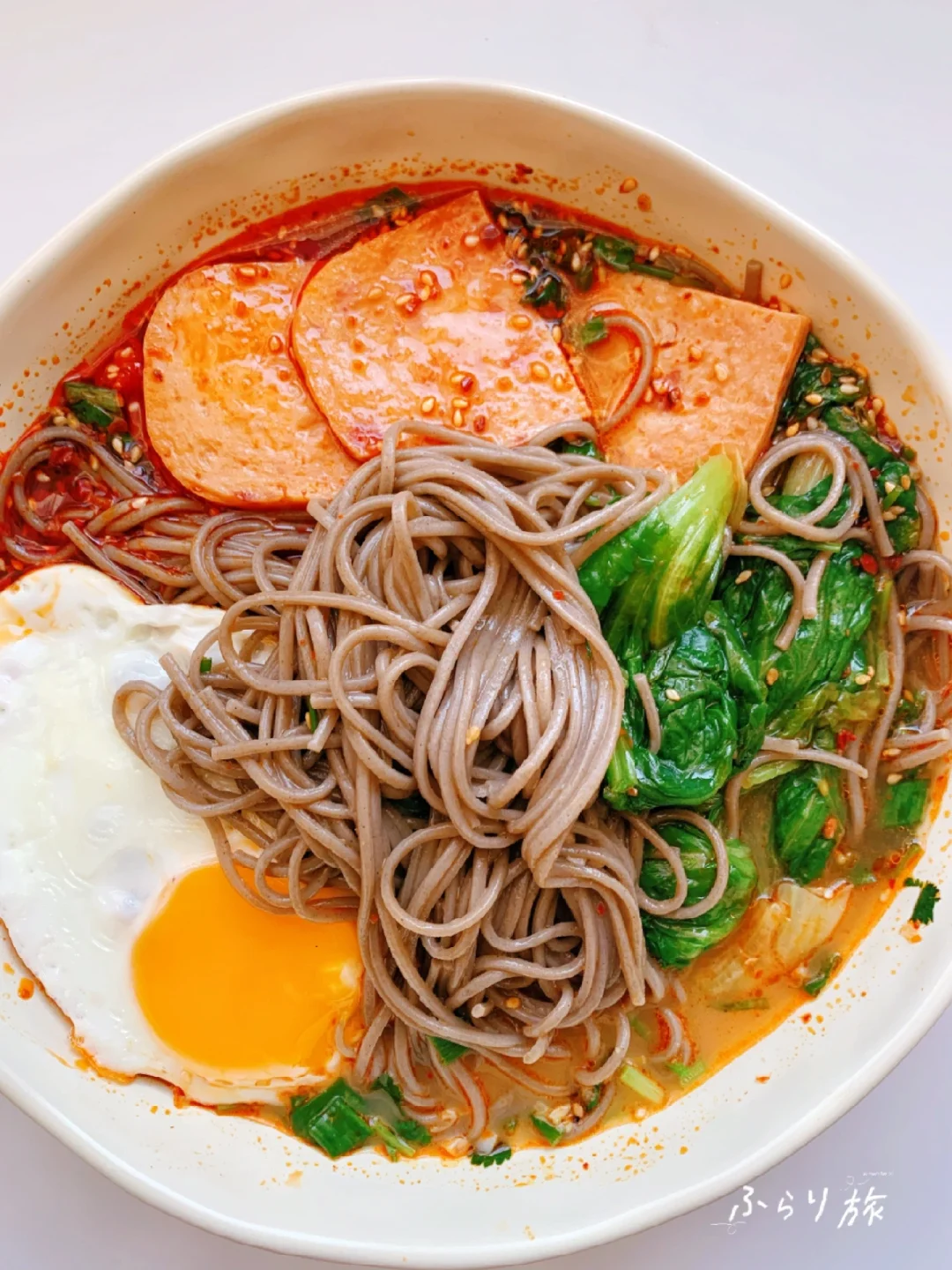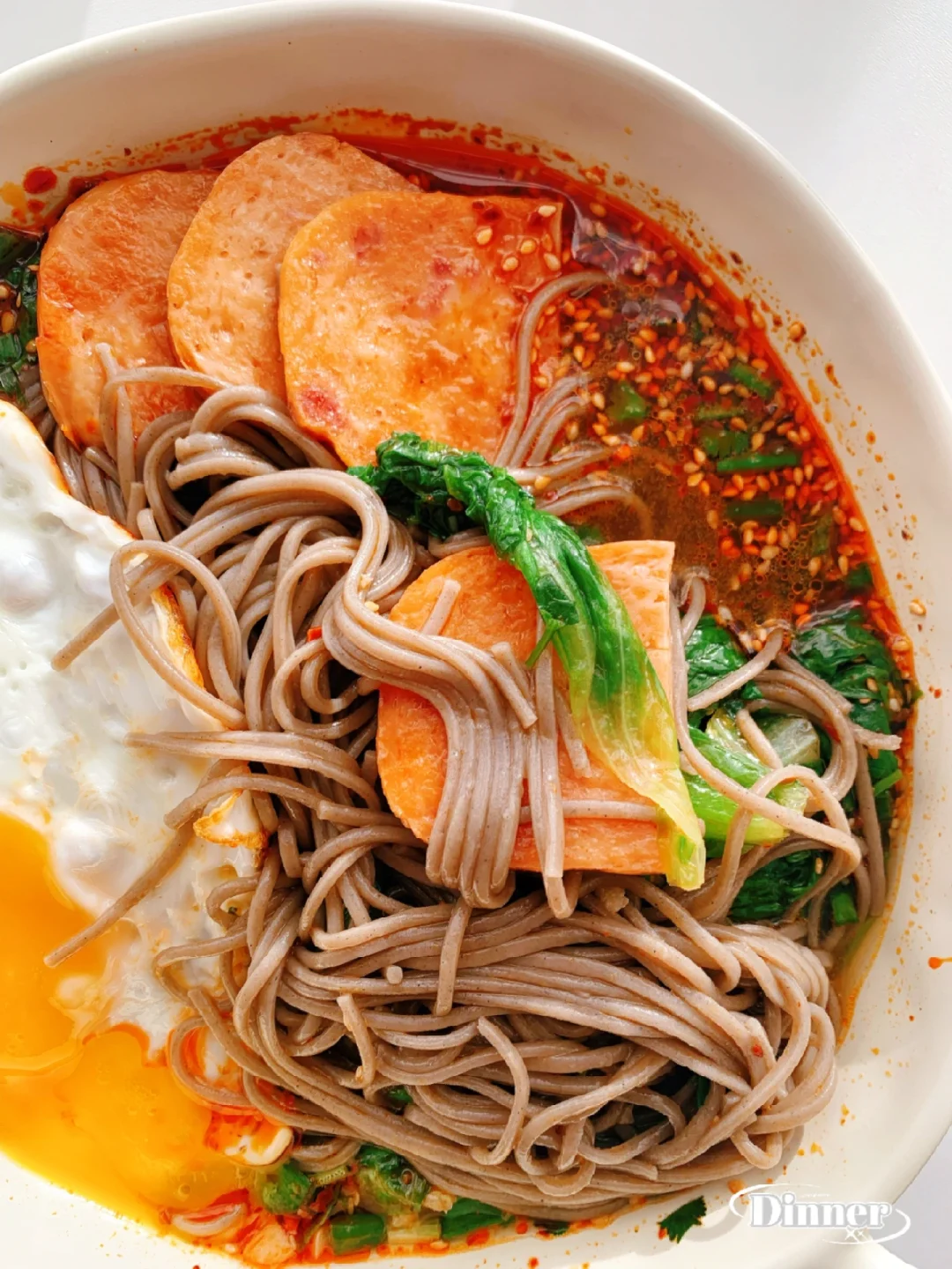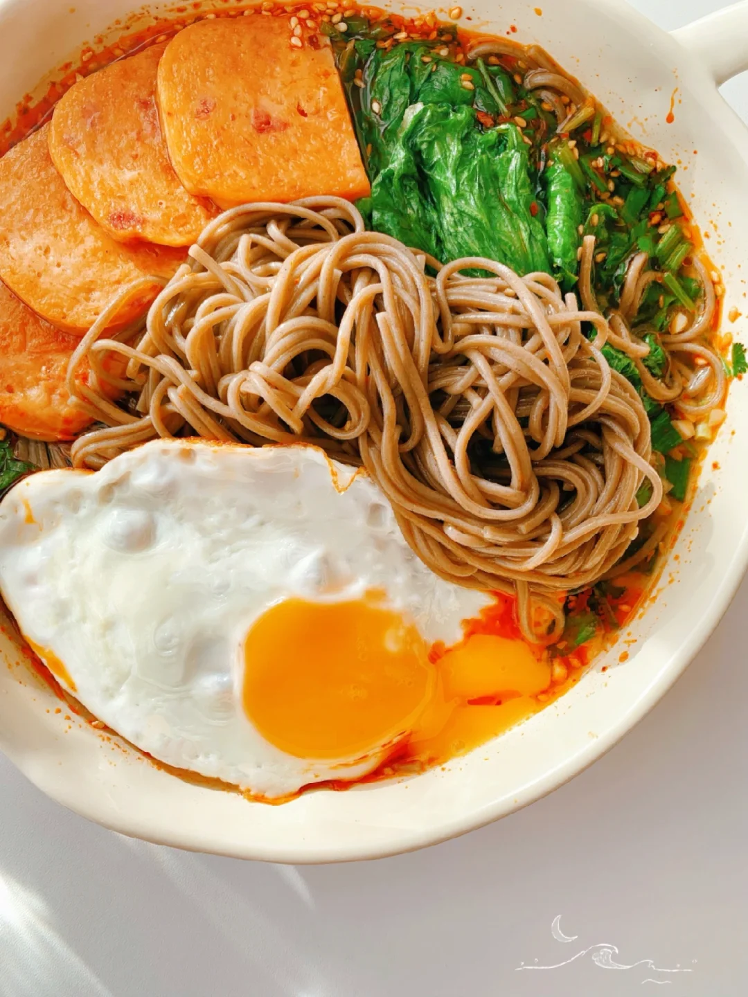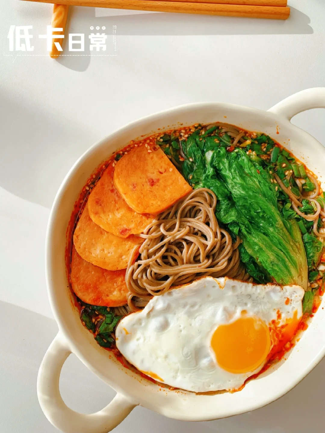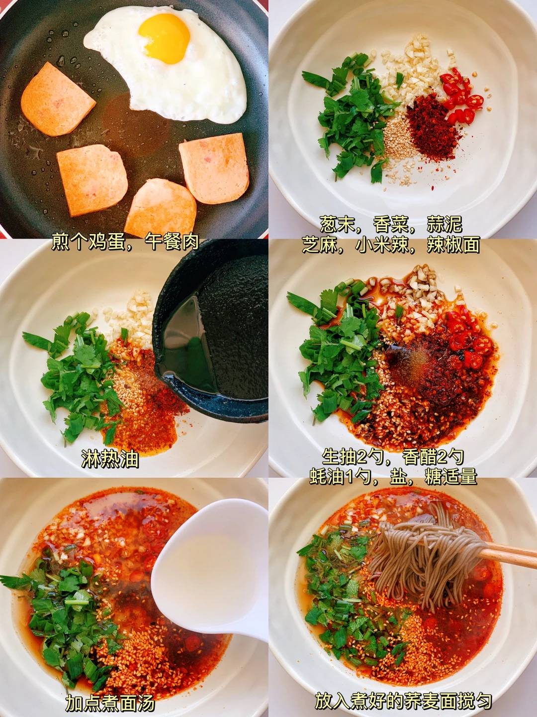自制低Gi减脂餐,我想让减脂餐更好吃✨✨✨ [飞吻R]hi,又是快乐的一天啊❗今日分享: ----- 【酸辣荞麦汤面】 ❤️食材: 主料:荞麦面条,鸡蛋,午餐肉,青菜 汤汁底料:葱末,香菜末,小米辣,辣椒面,蒜泥,白芝麻,生抽2勺,香醋2勺,蚝油1勺,白糖,盐适量 做法见图片 ✨✨又是快乐减脂的一天呀❗