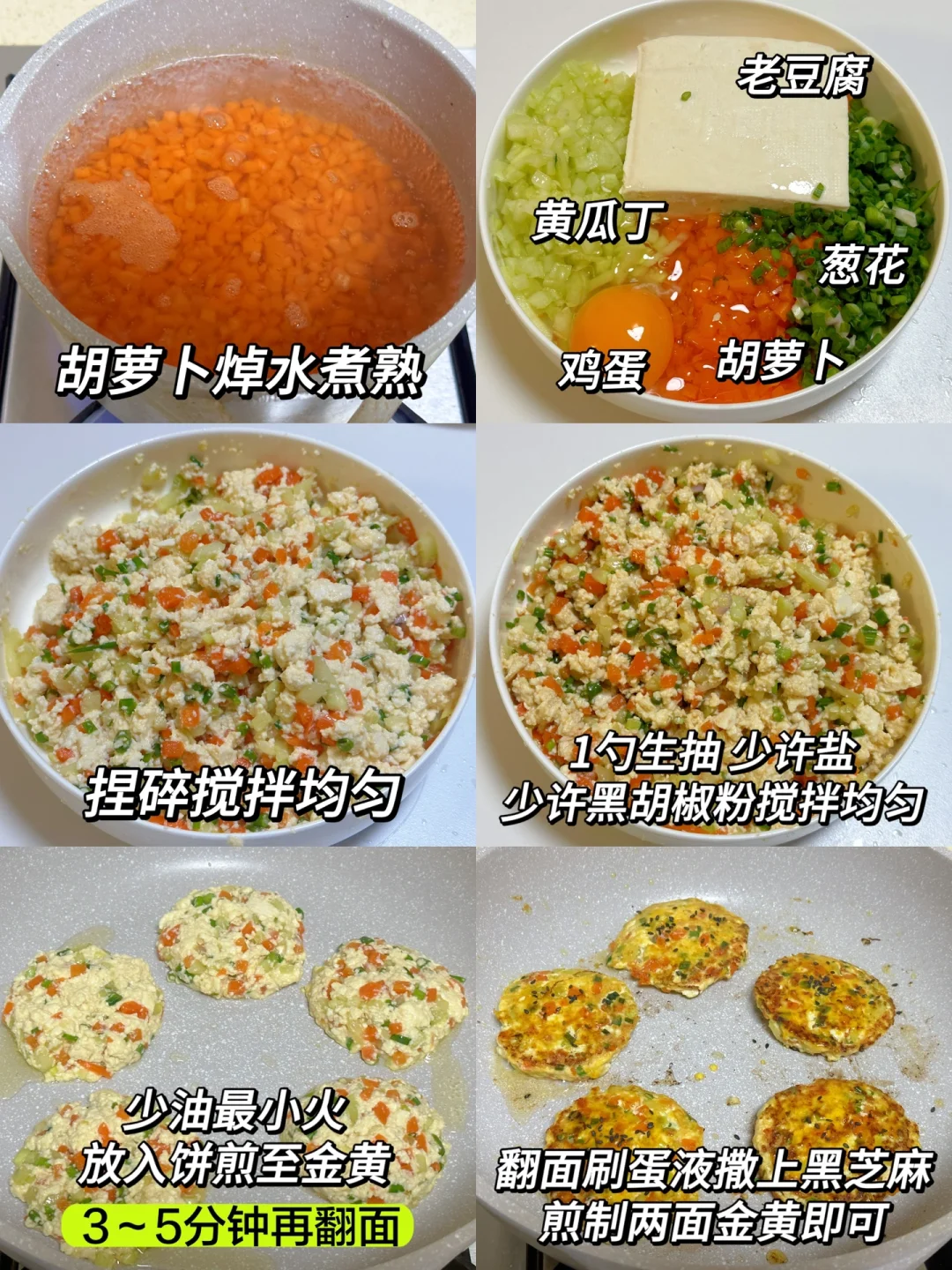 低卡低脂的减脂餐,所有减肥的姐妹们都去吃这个蔬菜豆腐饼,低脂高蛋白!外焦里嫩,巨美味!一大份才300多大卡,一个饼才30大卡,一份食材不小心做了11个,完全吃不完,吃2-3个饱腹感满满,简单易做,姐妹们赶紧试试吧! 🥗食材:豆腐、鸡蛋、胡萝卜、黄瓜、葱花 🥘做法:如图所示~ 煎的时候就闻到豆腐的香味啦~这个豆腐饼直接吃,蘸啥酱料都好吃,富含优质蛋白质,低卡低脂!减脂期可以放心吃,当午餐或晚餐,营养又健康,姐妹们都试试吧~