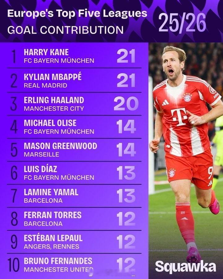 2025-26赛季五大联赛参与进球(进球+助攻)数据:1、凯恩(拜仁),21球(平均每52分钟造1球)2、姆巴佩(皇马),21球(平均每69分钟造1球)3、哈兰德(曼城),20球(平均每71分钟造1球)4、奥利塞(拜仁),14球5、格林伍德(马赛),14球6、路易斯·迪亚斯(拜仁),13球7、亚马尔(巴萨),13球8、费兰·托雷斯(巴萨),12球9、埃斯特班·勒波尔(昂热、雷恩),12球10、布鲁诺·费尔南德斯(曼联),12球
