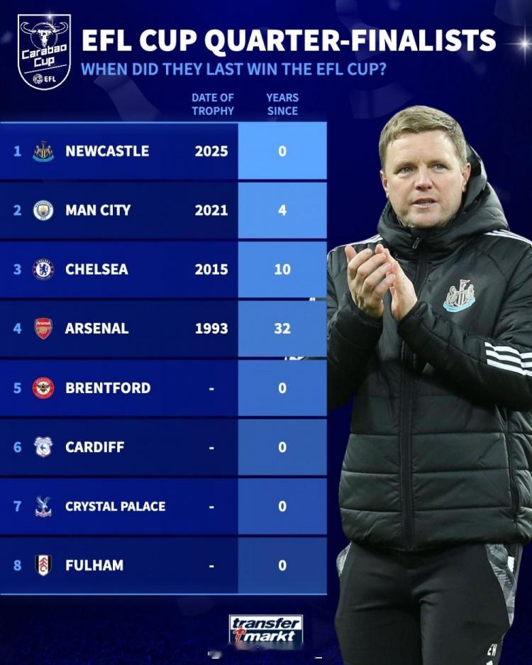 联赛杯八强上次夺得该项赛事冠军距今时间:纽卡斯尔,2025,0年曼城,2021,4年切尔西,2015,10年阿森纳,1993,32年布伦特福德、卡迪夫城、水晶宫、富勒姆,从未夺冠