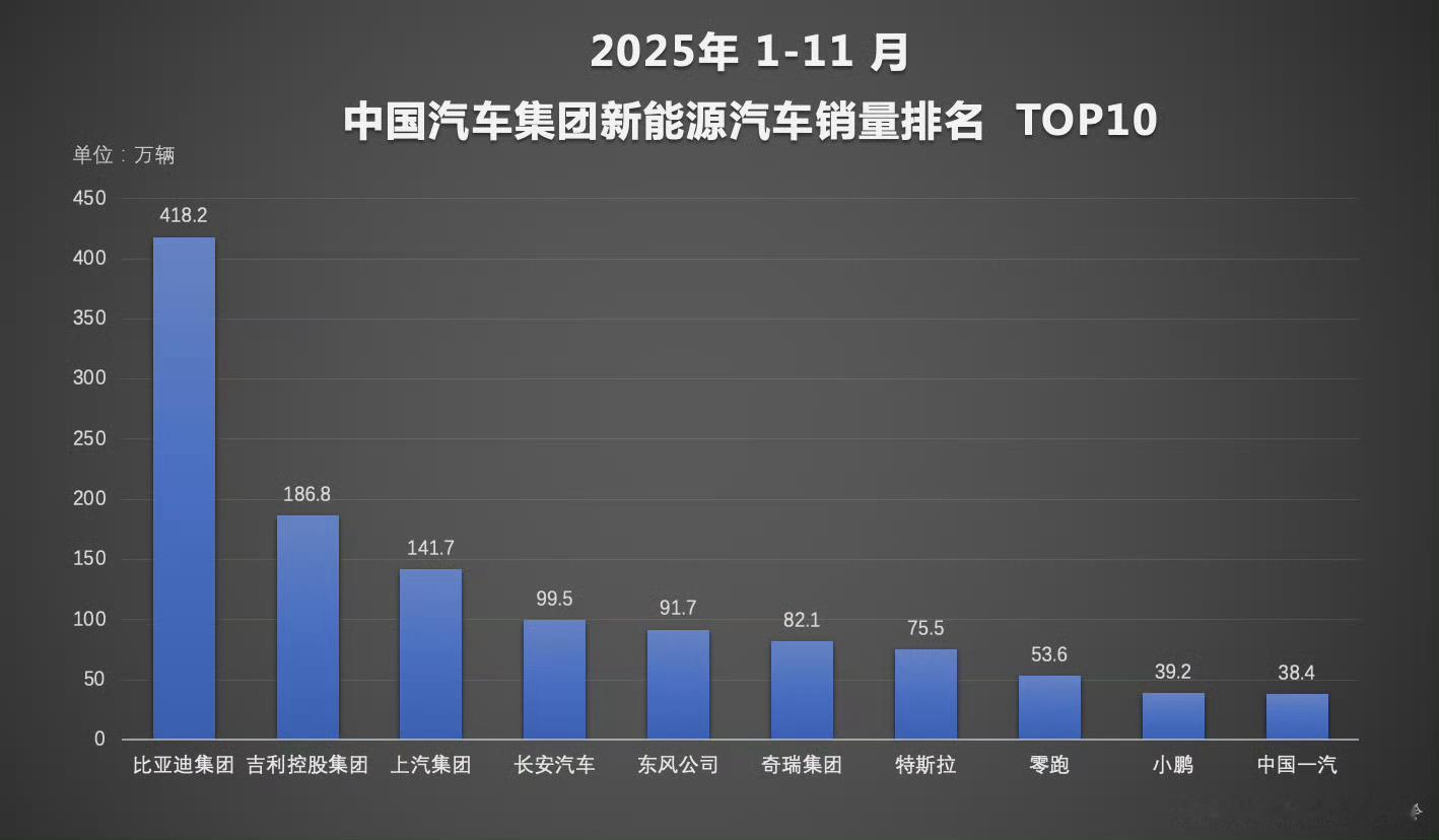刚看了各家车企在11月份的销量数据。依旧还是老样子——比亚迪表现亮眼持续领跑。2025年前11个月,卖出了418.2万辆车,在中国车企中一骑绝尘。在11月单月,销量是42.4万辆,比第二名大众和第三名丰田的销量加起来还要多。现在我可以不带任何修饰词地说,比亚迪在新能源汽车这个决定未来的赛道上,它的优势更是碾压级的,1-11月新能源车销量同样超过418万辆,几乎等于第二名吉利和第三名上汽的总和。换句话来说,你在路上每看到三辆新车,其中就有一辆很可能来自比亚迪。大概是去年,大家将本土车企,聊得最为火热的词就是:品牌力、创新力、技术储备等。毫无疑问,迪子现在已经不仅仅是一个成功的品牌,同样还是市场的「常量」。我这人喜欢刨根问底,喜欢掰开揉碎地讲一件事。所以有些时候我也在想,为什么比亚迪能做到这个成绩?有着工程师天团是最为重要的,但除此之外,能让我觉得最不可或缺的一环就是产业链。迪子目前完成了从电池、电机、电控到半导体,甚至造船运输的垂直整合。这种全产业链的掌控,带来的是极致的成本控制能力、技术迭代速度和供应链安全。它能从国际上突围,本质上就是对传统汽车工业「分工全球化」模式的一次颠覆。在汽车工业化的现代,拥有核心产业链纵深的企业,能将效率与创新的主动权牢牢抓在自己手里。过去,合资品牌是价值和技术的天花板。现在,比亚迪用品牌力定义了什么叫「主流」。这也导致了一些车企都不得不以它为假想敌,重新调整自己的产品定价、技术路径和推出速度。可实际上,很少车企能做到这般成绩。现在迪子的庞大体量,让它每推出一项新技术(如天神之眼、刀片电池、易四方、云辇等等),都能迅速实现规模化装车,这实际上是在为整个中国新能源汽车产业定义标准、教育市场并压低供应链成本。它的领跑,会让资源疯狂投向电动化、智能化,从而让我们整个汽车产业转型步伐比全球任何地区都要快。能有这样的领头羊牵引,我相信,一个全面领先全球的「中国汽车产业时代」会加速到来。