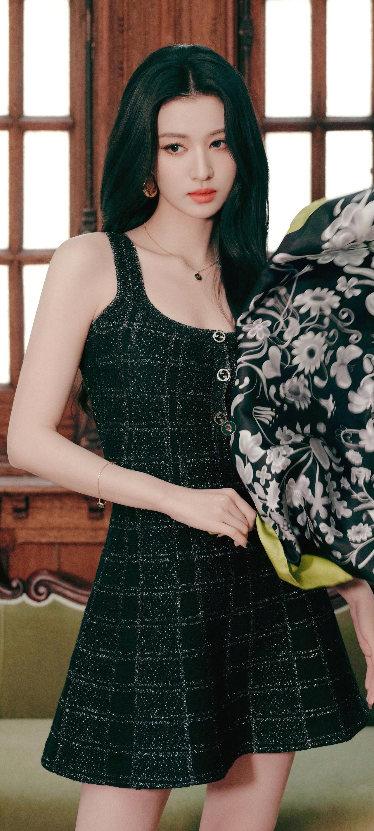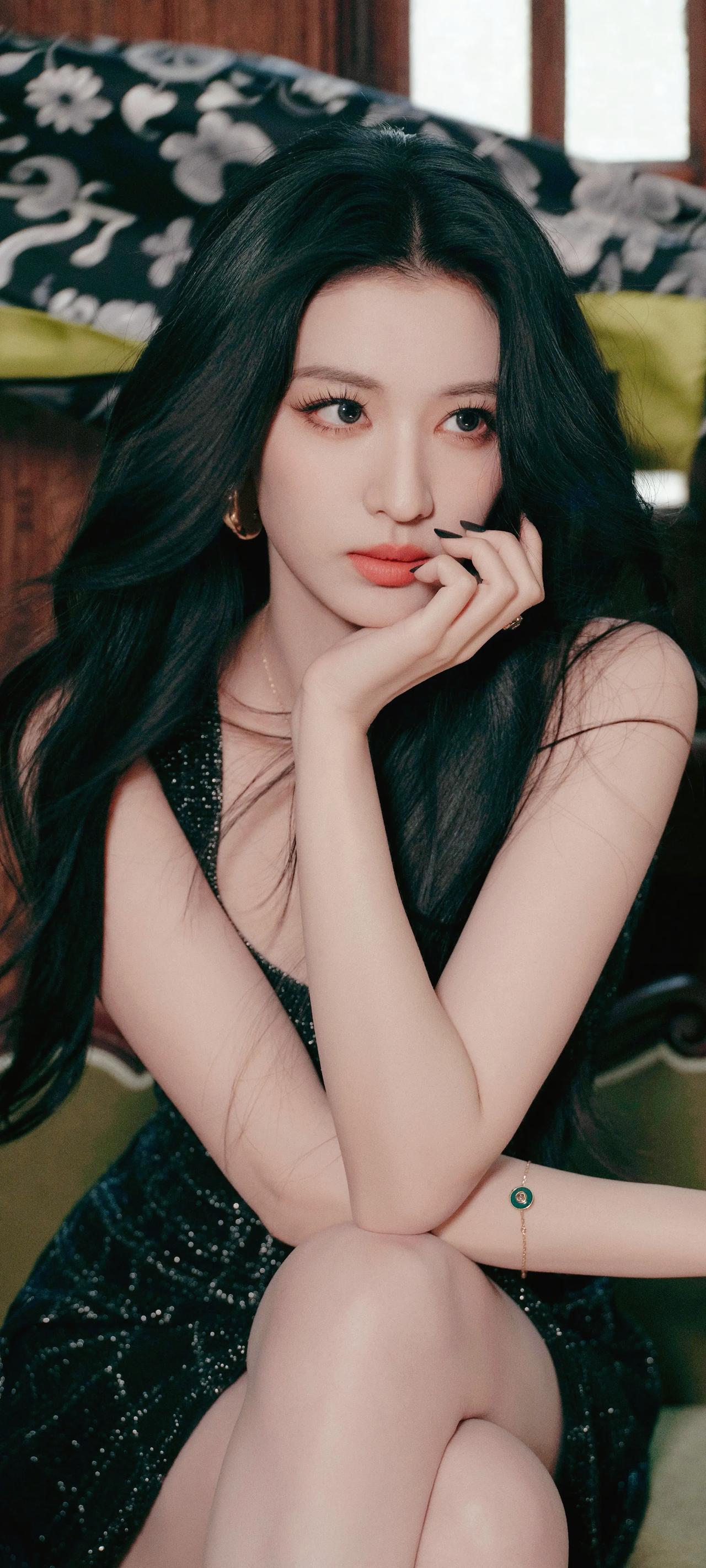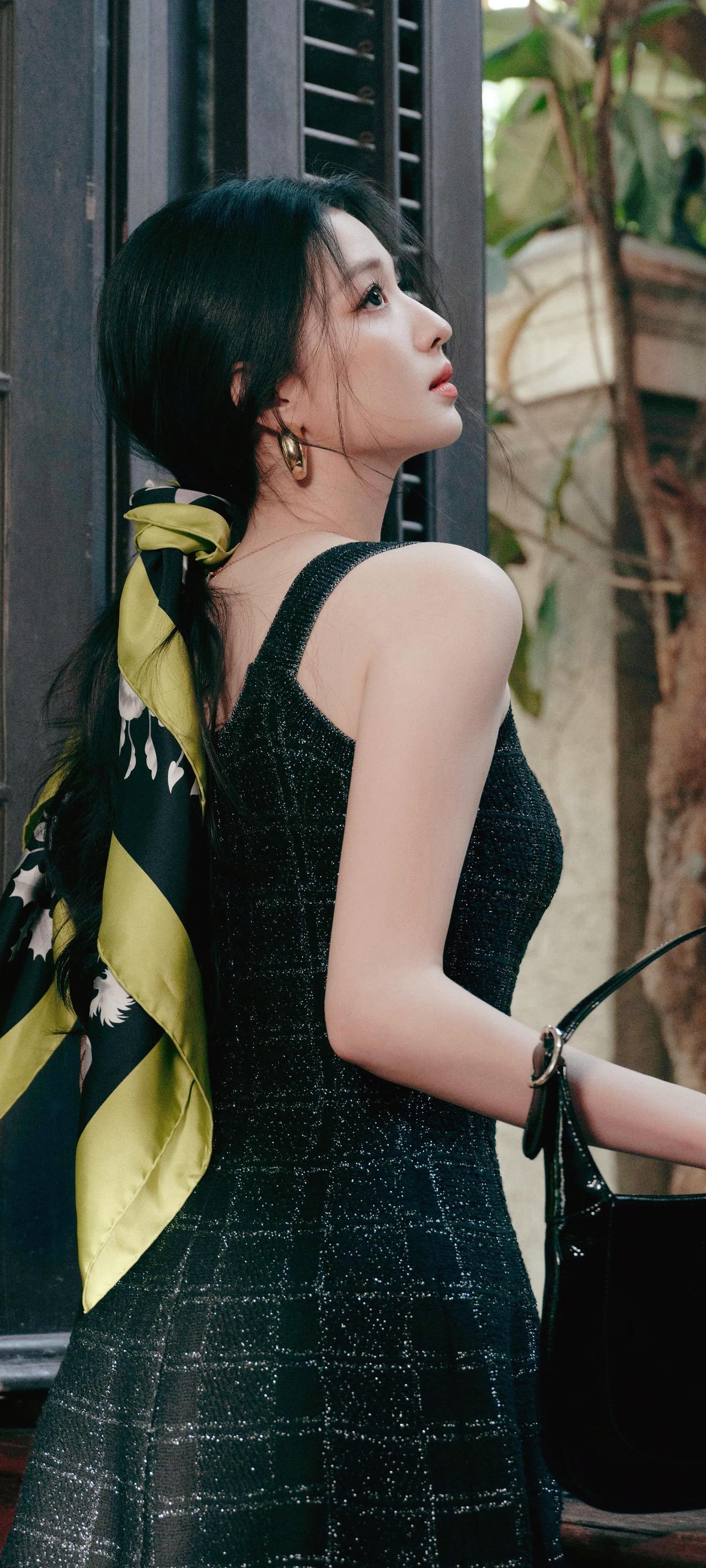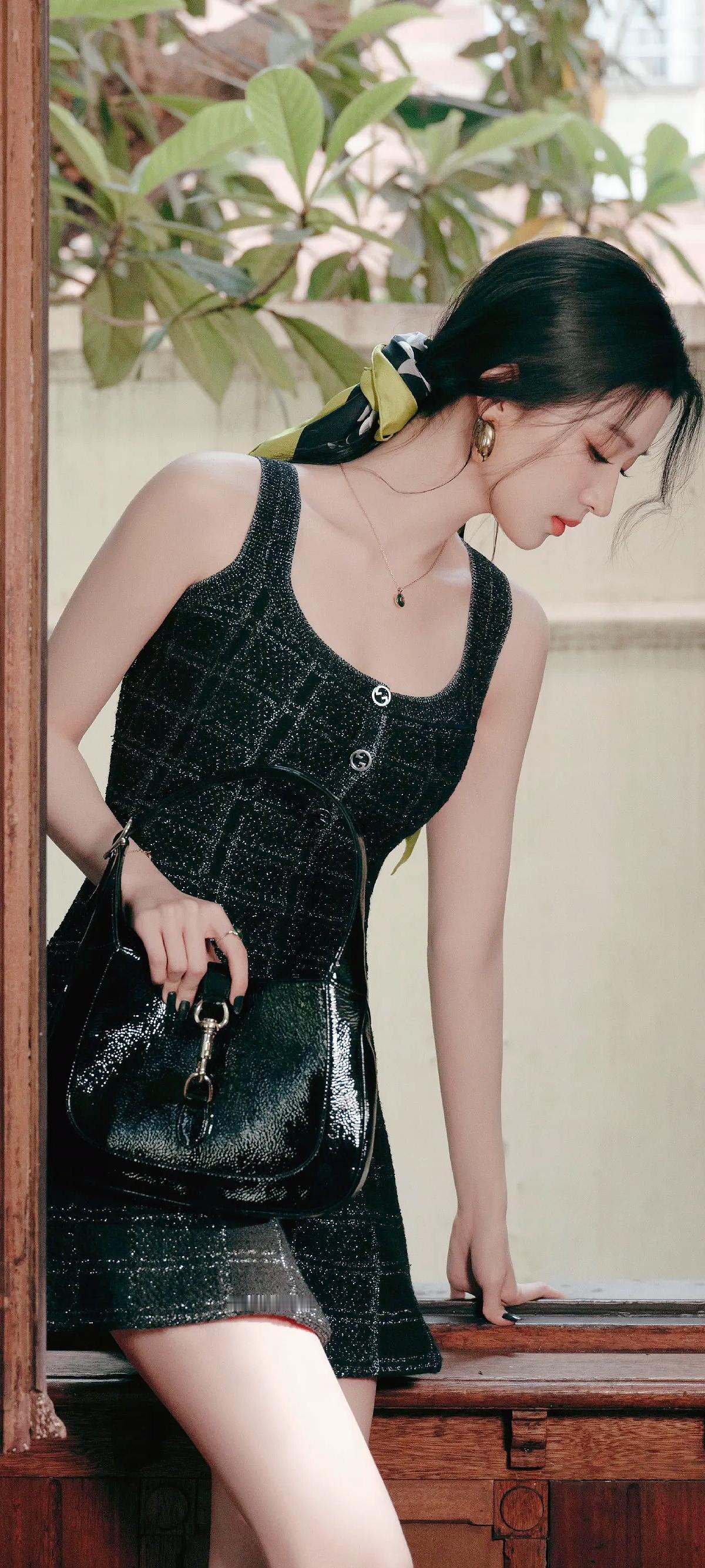 《青丝墨影》 原创诗词 原创看图片配诗 青丝垂缕绾芳结,墨裙星闪衬雪肌。 斜倚雕栏凝睇处,一颦皆是洛川姿。 玉腕轻拈包带细,红唇微绽惹风迟。 无端惹得春心动,疑是仙娥下翠微。