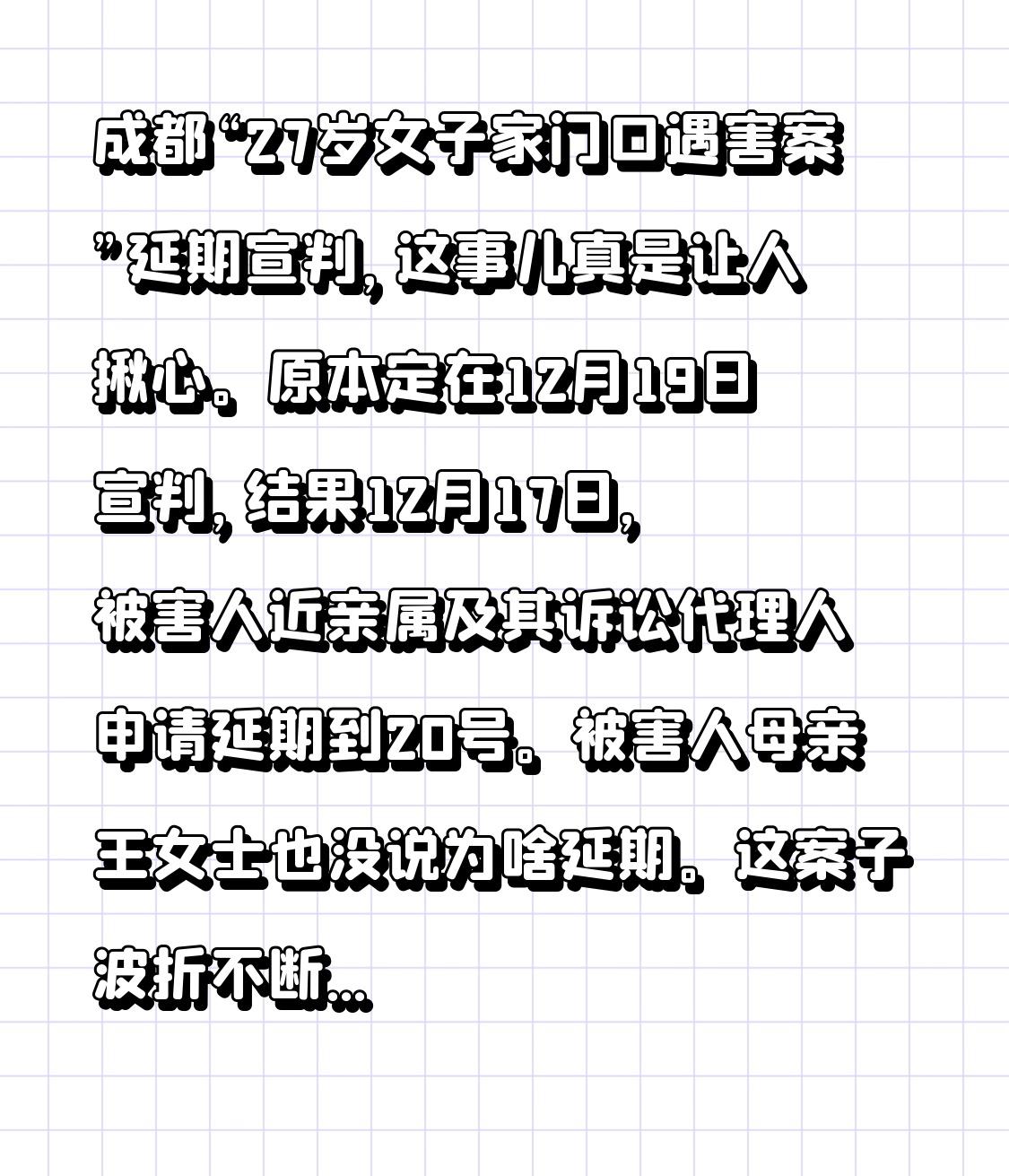 成都“27岁女子家门口遇害案”延期宣判,这事儿真是让人揪心。原本定在12月19日宣判,结果12月17日,被害人近亲属及其诉讼代理人申请延期到20号。被害人母亲王女士也没说为啥延期。 这案子波折不断,11月20日审理时,被告人梁某滢当庭拒绝辩护人辩护,案子就延期了。法院还指派律师为其辩护。12月16日继续审理,庭审里附带民事诉讼原告人还撤回了附带民事诉讼。希望20号宣判能给受害者家属一个公正的结果,让逝者安息。