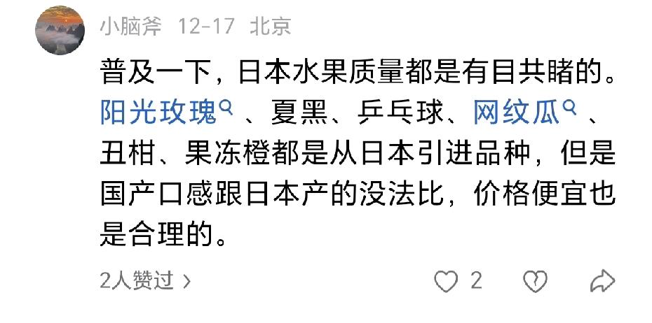 好家伙!连水果都能跟食品质量问题牵扯上。都是土里种出来的,水果还能有什么食品质量问题呢? 你要说用化肥吧?日本的亩均化肥使用量是我们中国的好几倍。 你要说用农药吧?日本的使用量同样比我们中国的高。 更关键的是,用化肥和农药不一定会改变水果的食品质量吧? 所以再怎么说来说去,日本的阳光玫瑰更好吃,中国的阳光玫瑰口感差,这一点根本就站不住脚。