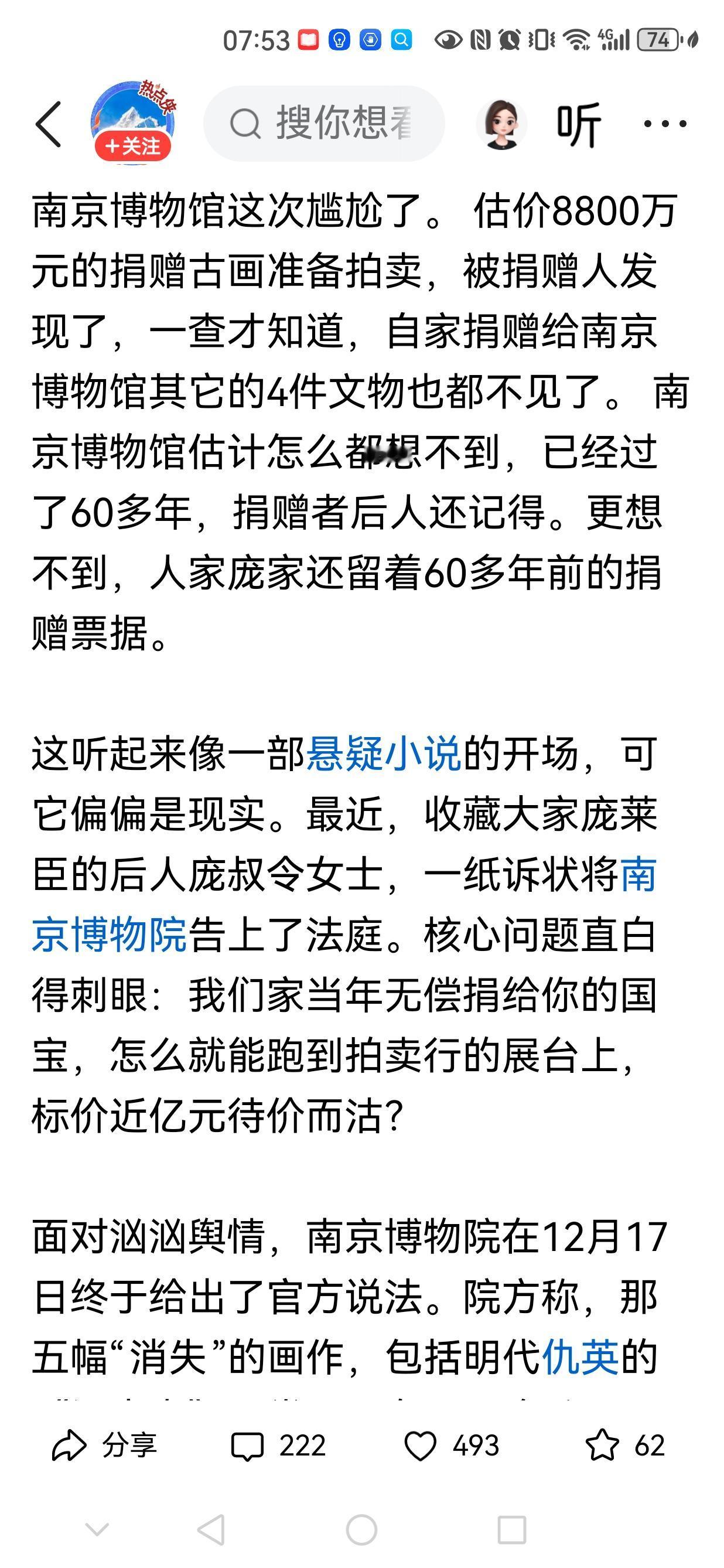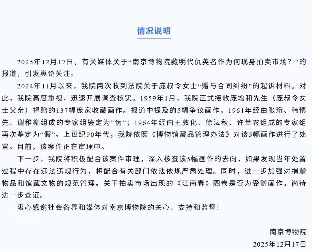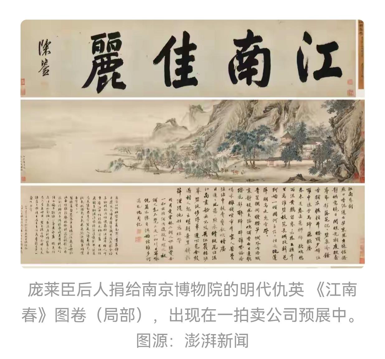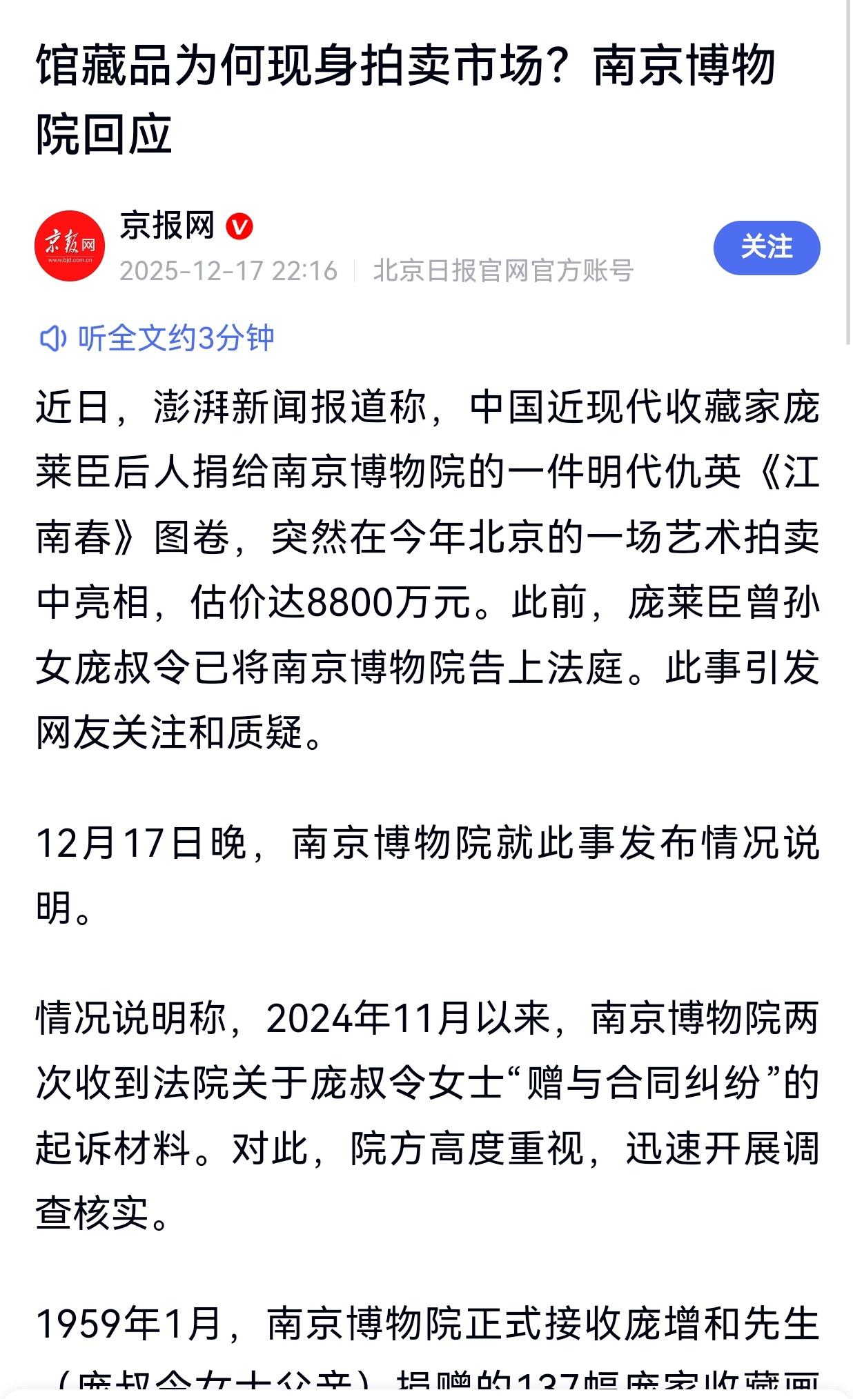 近现代收藏家庞莱臣后人,捐给南京博物院的一件估价8800万元的明代仇英《江南春》院藏品,60年后现身拍卖市场竟然被捐赠人后人发现了,而且后人还保留着当时的捐赠相关票据! 同时发现的还包括,庞莱臣家族捐赠给南京博物院的137件(套)藏品中还有另外4件也不见了!而院方的解释是:这5件作品(包括本次发现的明代仇英的《江南春》)分别在1961和1964年被专家鉴定为“伪作”,馆方以此为据进行了“处理”! 根据我国的《博物馆条例》和《文物保护法》,对于捐赠人捐赠的文物,即使是假的,南京博物院也不可以这样可以随意“私自处理”的!作为捐赠品,院方理应及时告知甚至退还捐赠人。 2025年12月16日,旁氏后人庞叔令通过签署《强制执行申请书》,正式向法院申请强制南京博物院提供其家族捐赠的《江南春》在内的5幅古籍作品的流转资料信息。 特别严重的是,南京博物院这次《江南春》事件,不禁让全体捐赠人对自己捐赠物品的“待遇”“是否被处理”产生了额外的遐想!