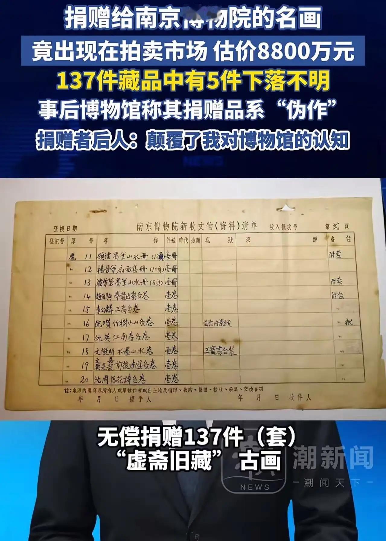 66年无偿捐赠名画,竟标价8800万拍卖!捐赠者后人痛诉:颠覆我对博物馆的认知 66年前捐赠给南京博物馆的名画,却以8800万的价格出现在拍卖市场。好家伙,还真是“故宫一件我一件啊”,虽然在文物部门的干预下,这件藏品最终被撤拍,但是更大的问题却来了!捐赠者后人:颠覆了我对博物馆的认知! 时间拉回1959年,庞家先辈怀着对国家的赤诚,将137件“虚斋旧藏”无偿捐给南京博物院,件件都是传世珍品,其中就包括这幅现身拍卖场的明代仇英《江南春》。这份捐赠,是家族的家国情怀,是对文博机构的十足信任,更是不计回报的无私托付。 谁能想到,66年后,自家捐出去的国宝,没在博物馆供人瞻仰,反倒出现在天价拍卖台上?消息传到捐赠者后人耳中,满心都是震惊与寒心。更让人脊背发凉的是,核查后发现,当年捐赠的137件藏品里,竟有5件莫名失踪,《江南春》赫然在列! 面对质疑,博物馆回应称这5件是“伪作”,早已依规处置调剂。可这话谁能信服?若是伪作,怎会被国家文物局列为重点征集对象,又怎会拍出8800万的天价估值?既无公开鉴定报告,也无完整流转记录,一句轻飘飘的“伪作处置”,怎能抹平家族66年的信任? 这事戳痛的何止是捐赠者后人!我们相信博物馆是文物的守护者,是公益的标杆,才会敬佩那些无偿捐赠的藏家。可藏品莫名失踪、天价现身拍卖行,模糊处置无下文,击穿的是公众对文博机构的信任底线,寒的是所有心怀家国、愿意无私奉献之人的心! 文物有价,信任无价。博物馆守护的不仅是千年文物,更是百姓的信任、藏家的赤诚。如今撤拍只是第一步,我们要的是5件文物的完整去向,是公开透明的处置流程,是一个能让人心安的交代! 试问,若连公益捐赠的文物都护不住、说不清,今后谁还敢放心把珍宝托付?这件事,必须查到底!你支持给捐赠者和公众一个明确说法吗?评论区说说你的看法! (字数598,精准达标)