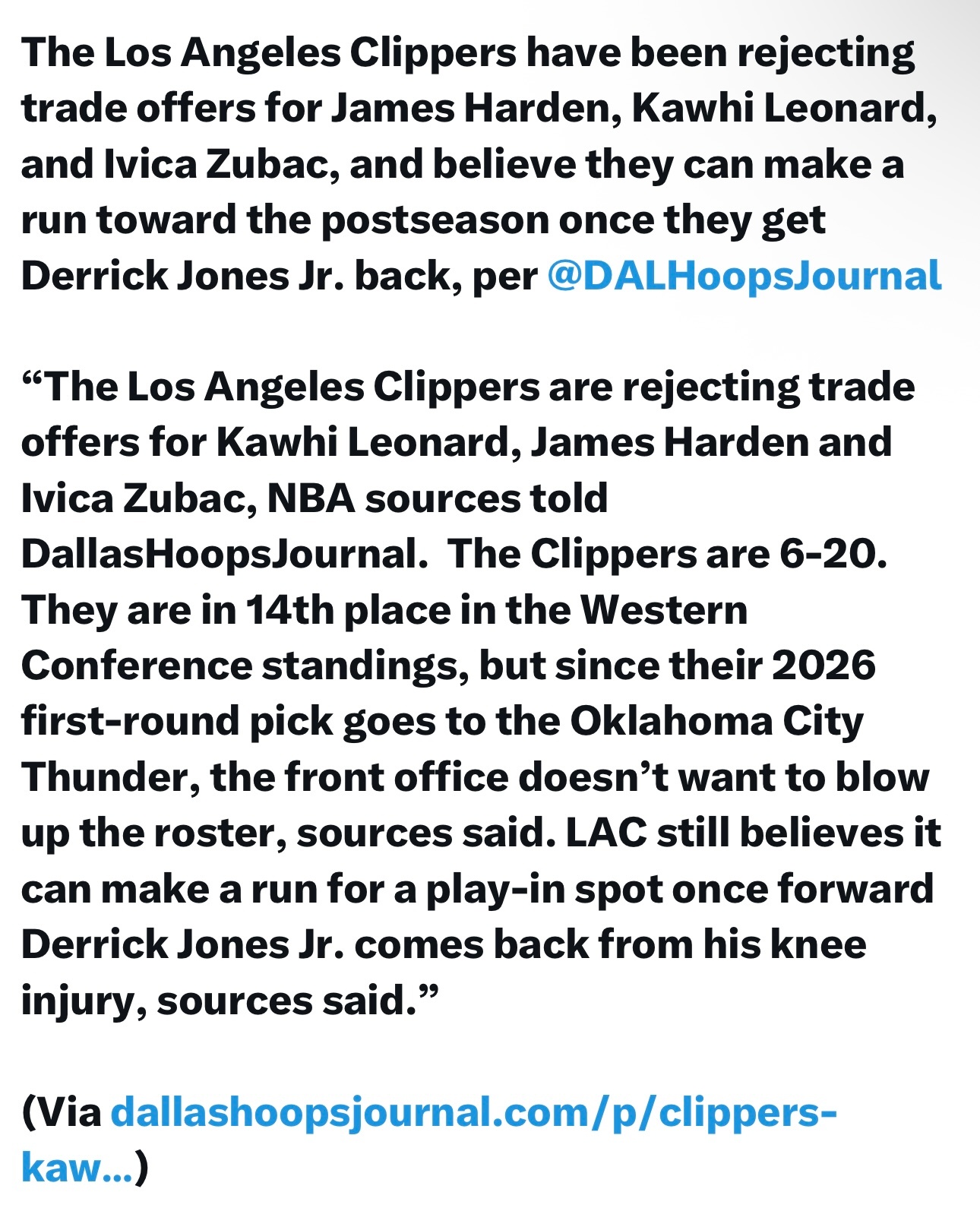 达拉斯媒体:快船队拒绝了关于哈登、伦纳德和祖巴茨的交易报价,并且球队认为,一旦小德里克·琼斯伤愈归队,他们仍有机会冲击季后赛。消息人士向《达拉斯篮球报》透露:“快船目前的战绩为6胜20负,位列西部第14位,但由于他们2026年的首轮签属于雷霆,消息人士称管理层并不想拆散现有阵容。此外,消息人士还表示,一旦小德里克·琼斯从膝伤中恢复,快船仍有机会去争夺附加赛席位。”