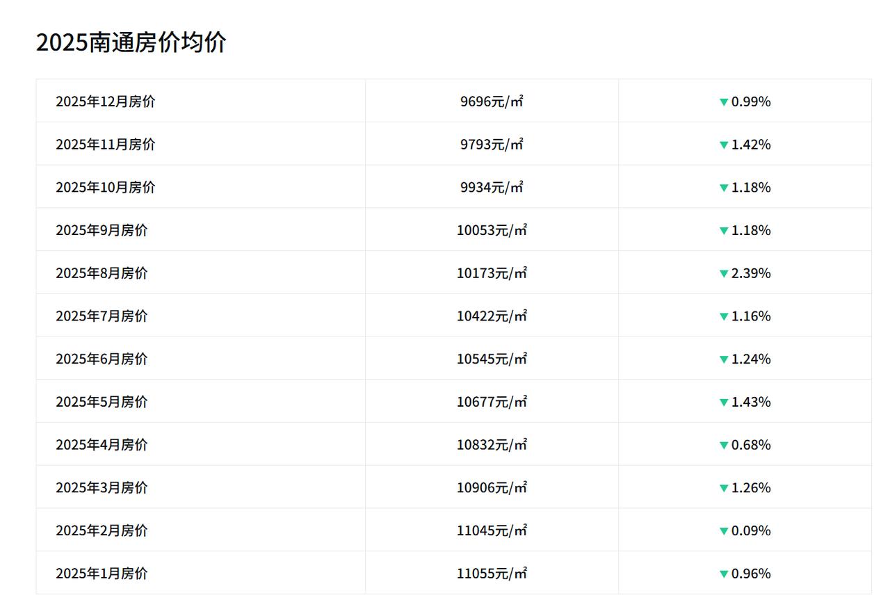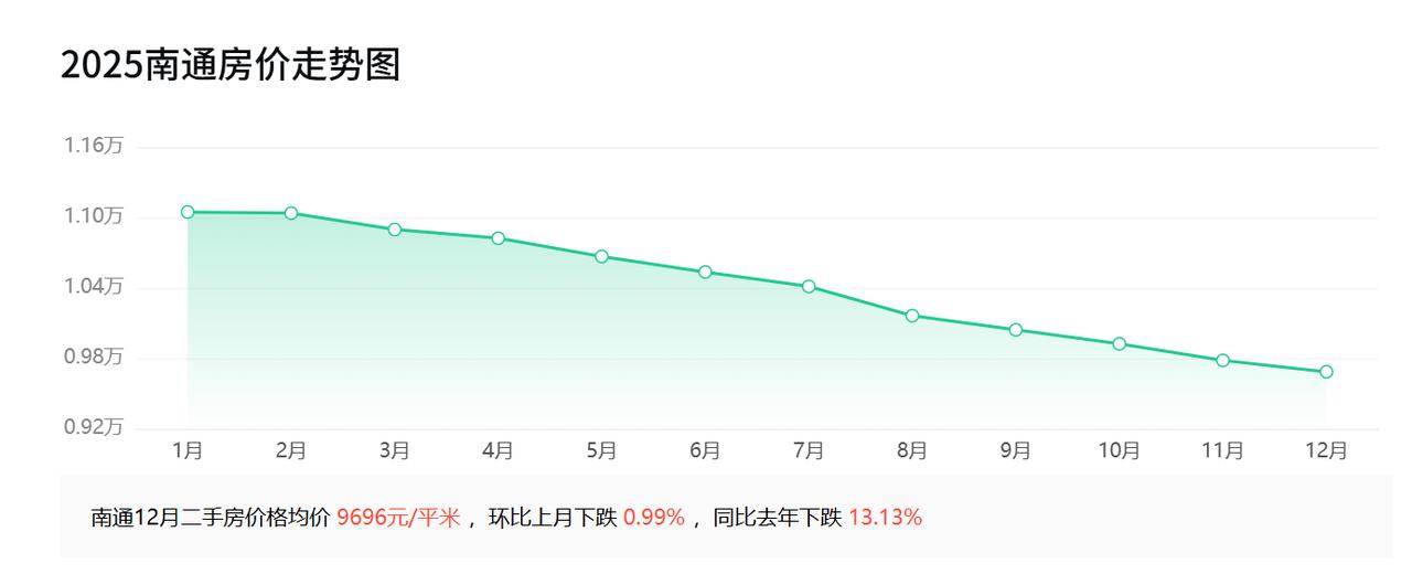 2015年11,南通房价均价8684元; 2016年11,南通房价均价8748元; 2017年11,南通房价均价10590元; 2018年11,南通房价均价11808元; 2019年11,南通房价均价13515元; 2020年11,南通房价均价15805元; 2021年11,南通房价均价16086元; 2022年11,南通房价均价15132元; 2023年11,南通房价均价13382元; 2024年11,南通房价均价11195元; 2025年11,南通房价均价9793元。 回顾南通十年的房价,2025年11月的9793元相比2015年11月的8684元,增长了1109元,涨幅达12.77%。相比2025年1月的11055元,下降了1262元,环比2025年10月的9934元,下降了141元。 2025年前三季度,南通GDP达9788.9亿元,按不变价格计算,同比增长5.4%。其中,第一产业增加值369.5亿元,增长3.5%;第二产业增加值4635.6亿元,增长5.0%;第三产业增加值4783.8亿元,增长6.0%。。 截至2024年末,南通市常住人口734.83万人,比2023年底减少5.27万人。 南通房价2025年11月比2025年1月下降了1262元,下降幅度不小,价格基本上回归到2017年水平。不过也得看区域,核心区域的房价不降反增,远郊地区房价下跌明显,拉低了整体平均价格。 那么,在刚刚过去的11月份,大家对南通的楼市有什么切身的体会,咱们在评论区聊一聊。 数据说明:以上均价数据,均来自安居客数据,仅作为分析参考,旨在反映南通近十年的房价走势,不能准确映射当地实际房产价格。因为新房、二手房、不同区域不同位置的房价差别较大,占比也不同,仅通过一个均价不能一概而论。