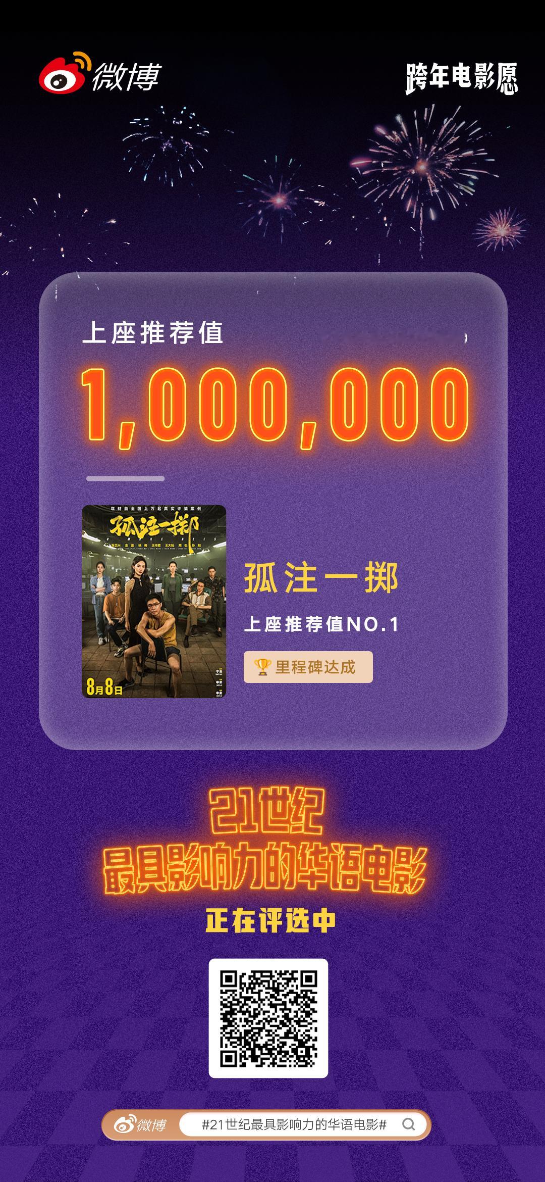 孤注一掷影响力推荐值破100万🏆里程碑达成!恭喜电影《孤注一掷》在21世纪最具影响力的华语电影评选中,上座推荐值率先突破100万,目前暂列第一。这部以反诈为主题的影片以真实震撼的力量,叩击无数观众心灵,也唤起社会对网络安全的深切关注。每一位选择“入座”的观众朋友们,正是你们让这部电影的影响力持续蔓延。跨年电影愿点击推荐>>21世纪最具影响力的华语电影