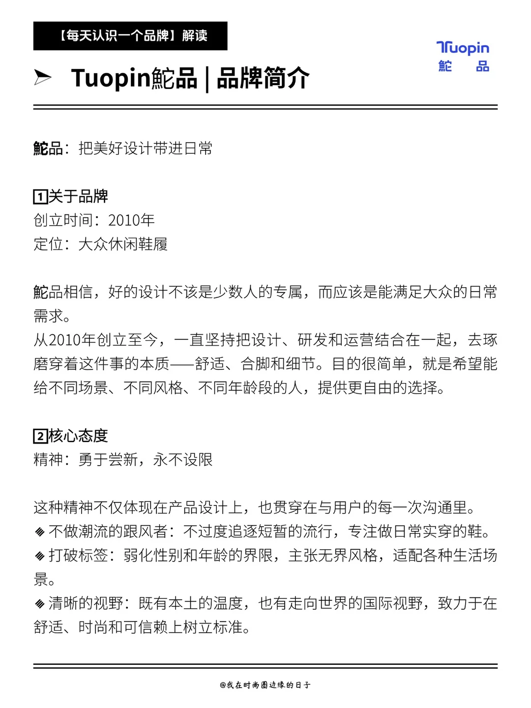 从2010年创立至今,一直坚持把设计、研发和运营结合在一起,去琢磨穿着这件事的本质——舒适、合脚和细节。目的很简单,就是希望能给不同场景、不同风格、不同年龄段的人,提供更自由的选择。