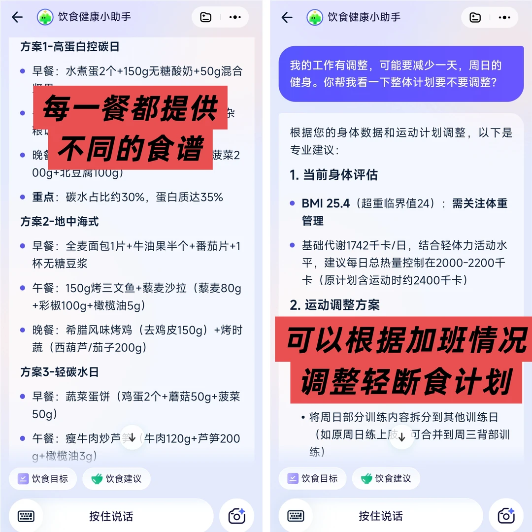 而且我也不用自己算卡路里,用阿福对着餐食拍一张,它就帮忙计算热量。也不用自己搭配食物,它会自动生成食谱,减肥食谱一周瘦10轻断食,还可以灵活根据加班情况即时调整轻断食计划 。