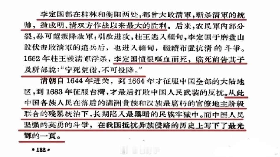 👇下图👇是1958年出版的《初级中学课本·中国历史第二册课堂教学参考书》,由上海市教育局教学研究室编,新知识出版社出版。内容主要讲述了明末清初时期,南明将领李定国在桂林、衡阳等地抗击清军的事迹,以及清朝最终统一全国的过程。警惕1644史观带乱了节奏到底是谁带乱了节奏???谁都不能否认明清以及任何王朝更迭都是中国历史!这是家喻户晓,妇孺皆知的,所以,这句话是否属于多余呢?李定国抗清事迹桂林、衡阳大捷:李定国部在桂林和衡阳两处大败清军,斩杀清军统帅,这是明、清双方作战以来的最大胜利。内部矛盾与失败:后来,农民军内部分裂,孙可望叛降清军,引敌进攻,导致桂王逃入缅甸。李定国在磨盘山设伏击败清军追兵后,也进入缅甸,继续布置抗清斗争。悲壮结局:1662年,桂王被清军俘杀,李定国愤恨呕血而死。临死前告诫其子及所部:“宁死荒徼,不可投降。”清朝统一过程时间线:1644年:清朝入关。1664年:征服中国全部大陆地区。1683年:征服台湾,最终打败中国人民武装的反抗。历史评价统治性质:清朝统一后,中国各族人民在满洲贵族和汉族腐朽官僚地主阶级的联合残暴统治下,长期陷入黑暗的民族牢狱中。人民斗争:中国人民坚强英勇的斗争,在抵抗异族侵略的历史上写下了光辉的一页。这段文字反映了当时历史教科书对明清交替时期历史事件的叙述和评价,强调了人民反抗外来侵略的英勇精神。热点观点 🎈相关内容推荐:点击链接阅读➡️网页链接专栏 · 历史长河 | 家国情怀 | 怀念伟人