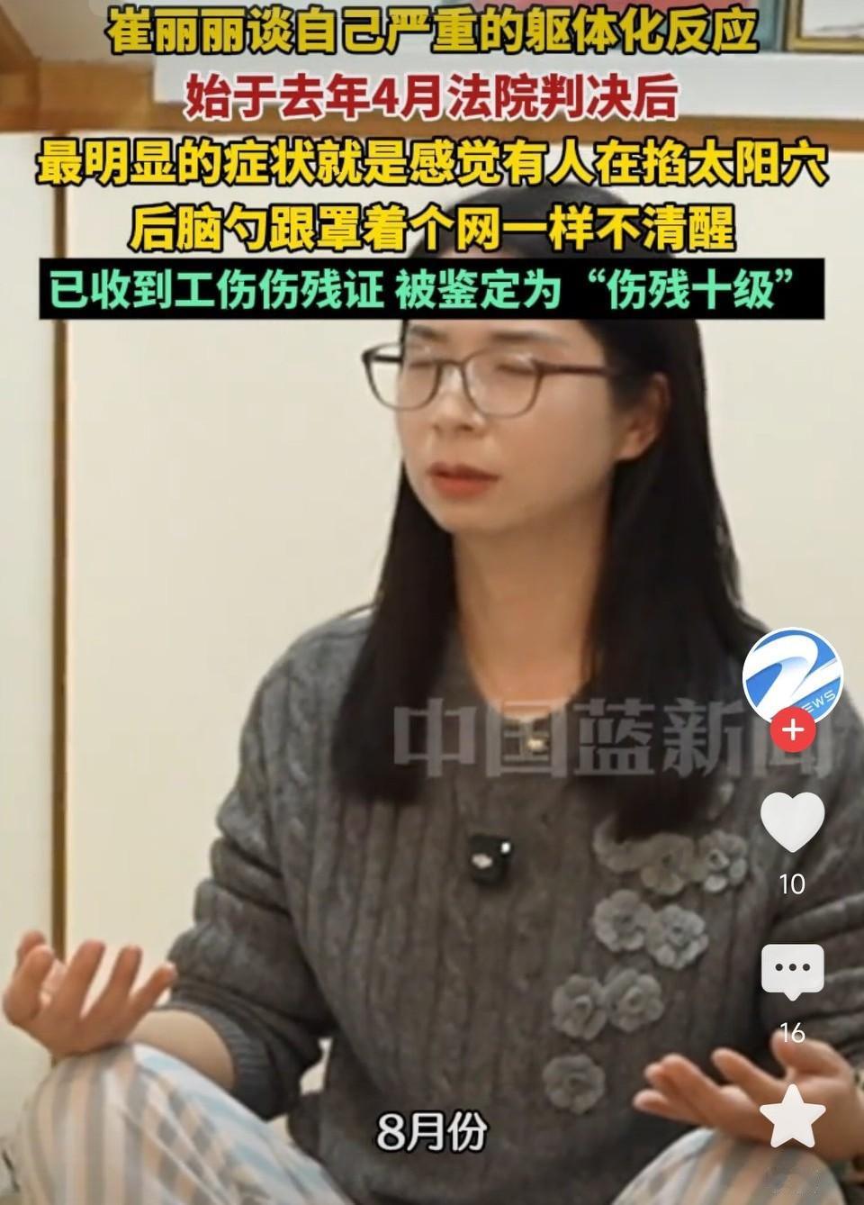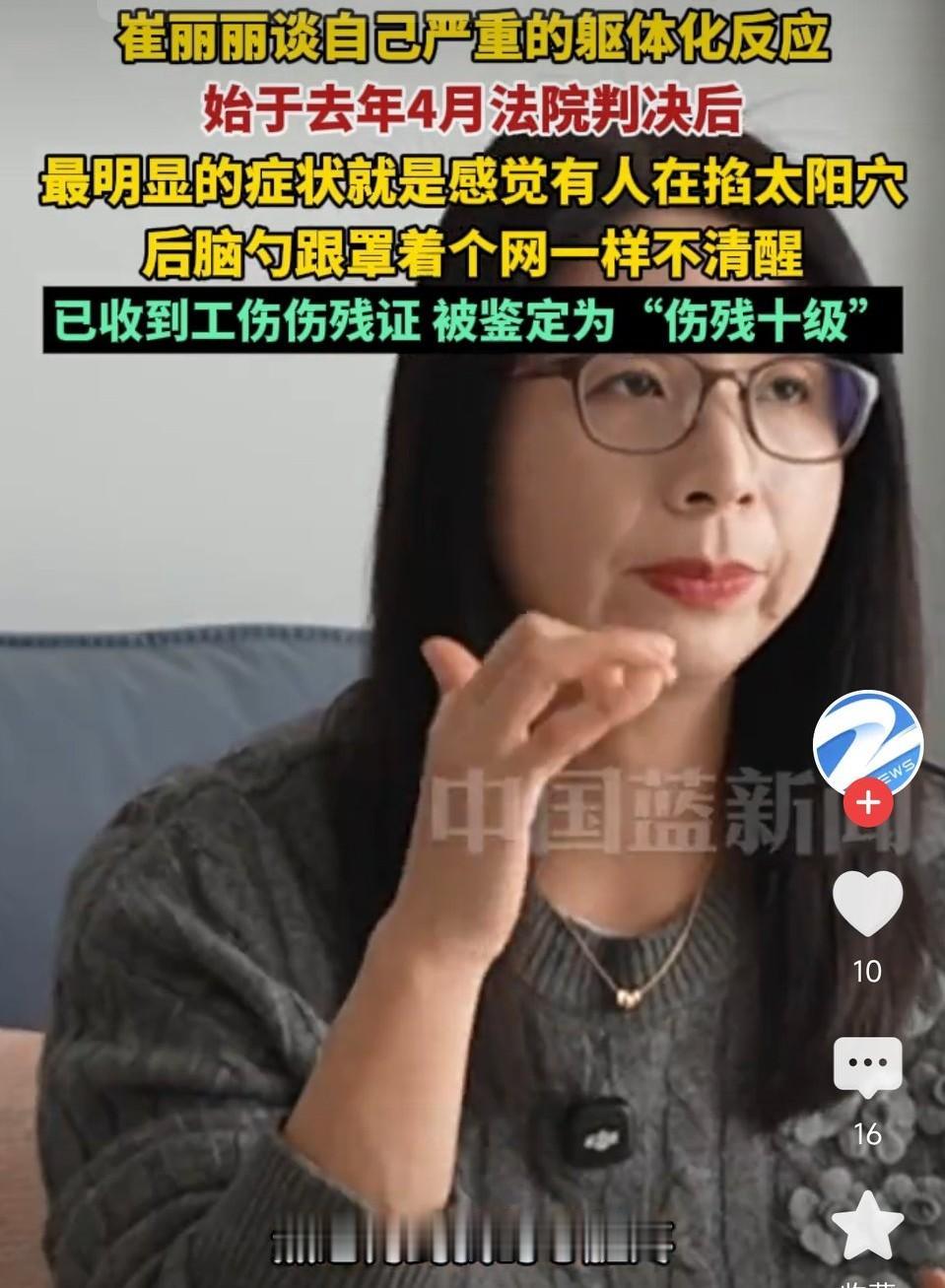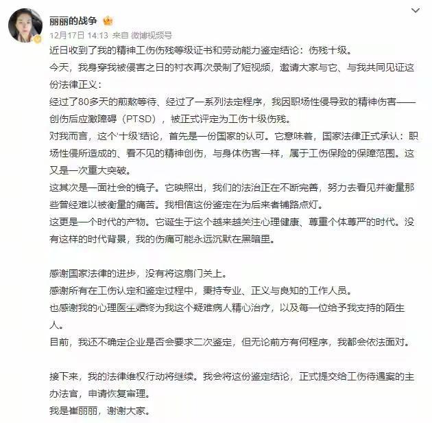 崔丽丽被正式评定为工伤十级伤残!本人发文:我身穿被侵害之日的衬衣,请大家共同见证法律正义! 网友表示: 纯属赤裸裸的敲诈勒索,这种人现实生活中利己主义很强,恐怖如斯! 看她在网上怼天怼地怼网友的劲,不像有精神障碍! 这女的折腾好久了,经常网上看见她的这个事。这个老板不晓得多慌! 饥不择食的老板,终究为了一时快活付出了惨痛教训! 这给以后的很多投机分子有了缝隙,也给所有老板敲响警钟,管好自己的下半身否则赌上一辈子。豪登,中登,小登,包括太上登们把理智财产看好咯。 精神类创伤认定,大部分都是白扯,不说话少说话目光呆滞,情绪爆发,都能评上,头一次看到用精神伤残作为法律依据的,这俩夫妻直播时的状态,完全不像有精神创伤的样子! 一想到她笑成那样,还10级,太扯了!这是怎么评定的? 崔丽丽案 崔丽丽强奸案 崔丽丽工伤认定