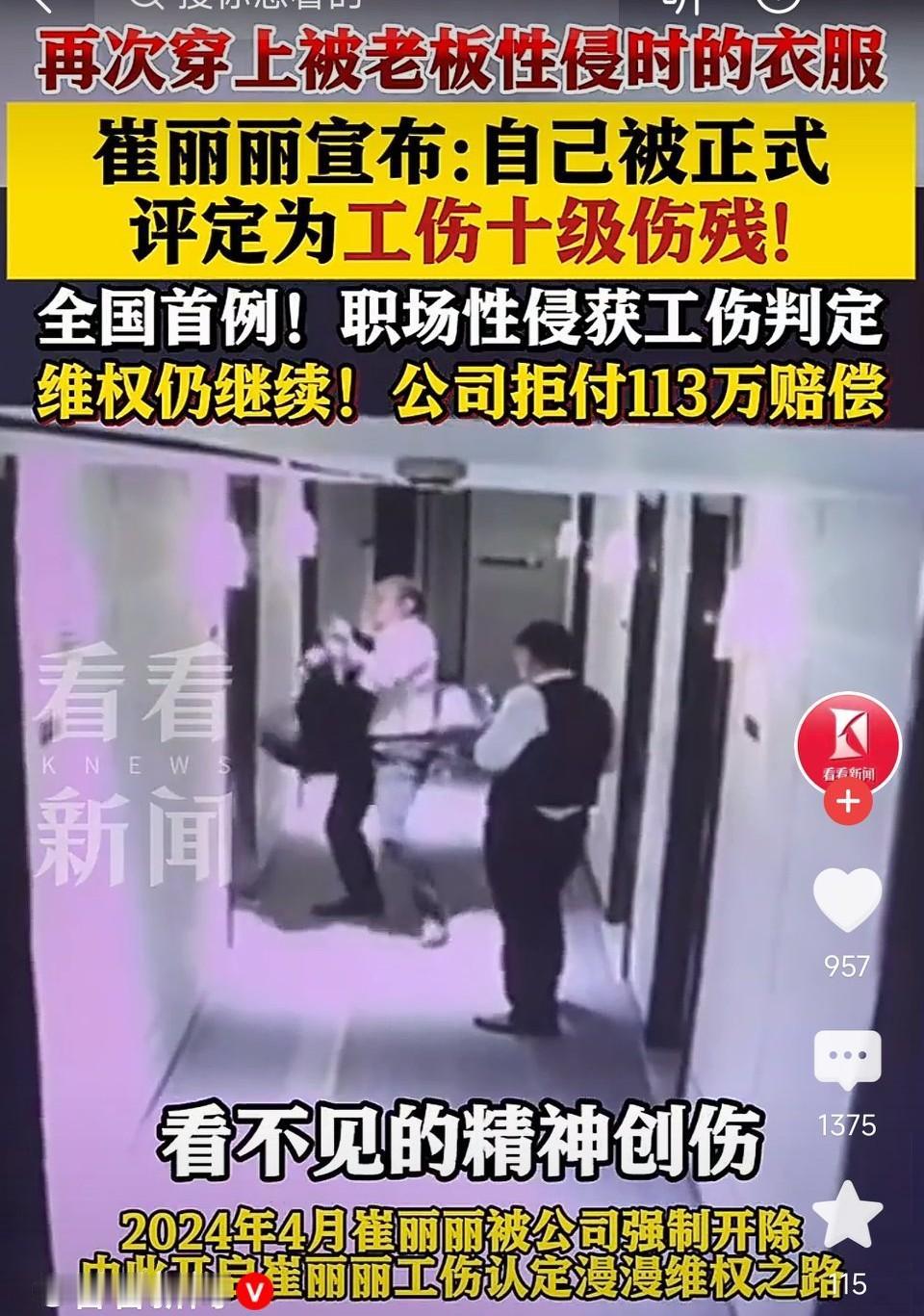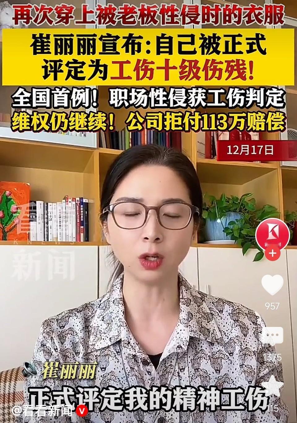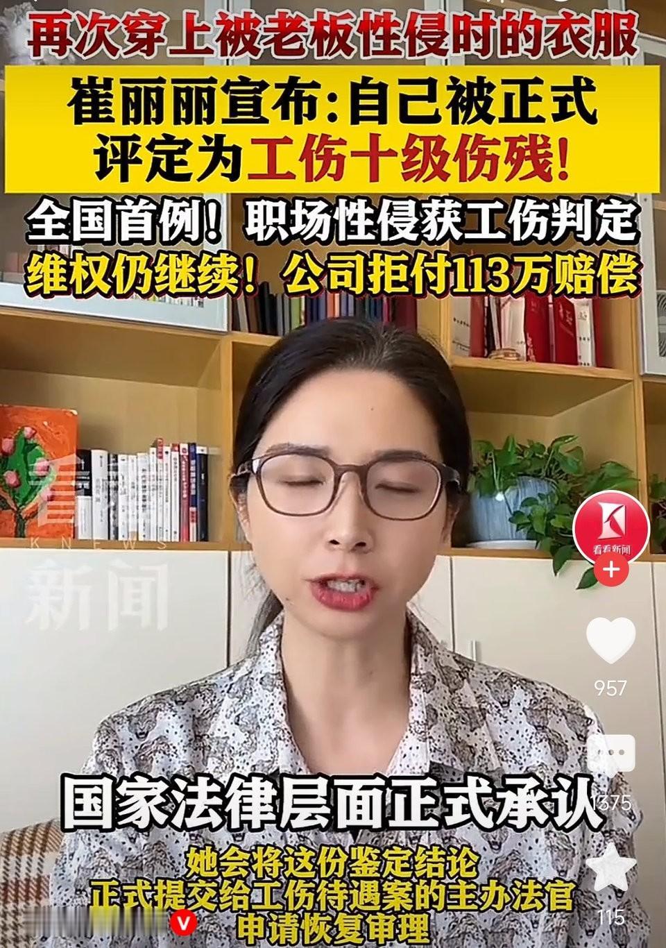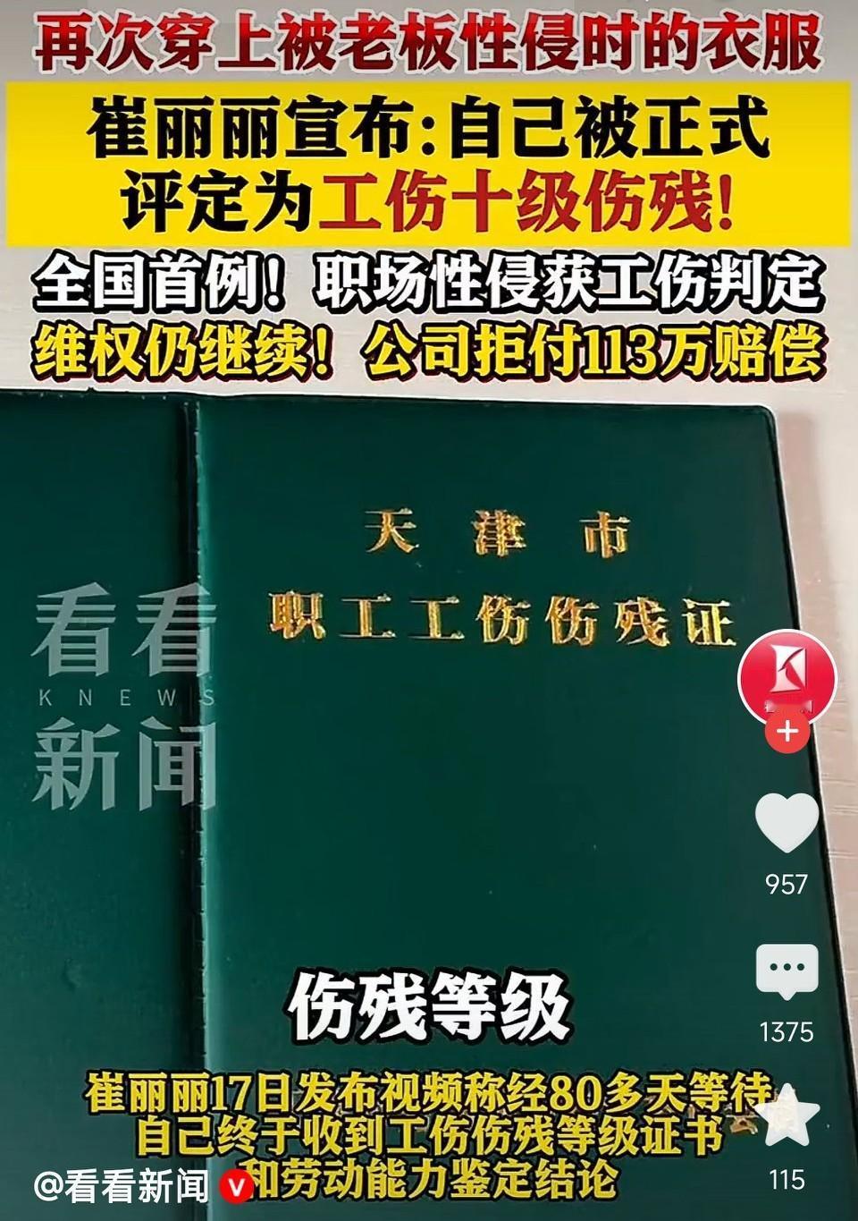 崔丽丽被正式评定为工伤十级伤残:我身穿被侵害之日的衬衣,请大家共同见证法律正义! 首先,十级伤残是什么程度? 十级伤残是伤残等级中最轻一级,核心为轻度功能障碍、无护理依赖、生活可完全自理,具体包括器官部分缺损、形态异常,无功能障碍或轻度功能障碍,无医疗依赖或仅一般医疗依赖,无生活自理障碍。 崔丽丽还穿着以前的战袍,这完全看不出有心理创伤啊!还能这么灵活运动,语气亢奋,情绪高涨! 王老板是唯一说她漂亮的,结果还被她送进去了,现在大概肠子都悔青了! 只说被侵犯维权,我觉得她做得是对的,但是不要用一种气势汹汹的口气来与社会交流。你通过平台实现揭露和鸣冤合情合理,但对于社会,没有人伤害了你,你不能用一种连带了社会所有人的态度来对待社会,社会给了你关注已经给了你极大的帮助! 感觉她把自己当成律师了,说话铿锵有力,一点都不像受害者! 相反,我怎么从她的字里行间、语言表达里,感受到她的自豪呢?崔丽丽工伤认定 伤残级别预估 上班时遭受性侵能否认定为工伤?