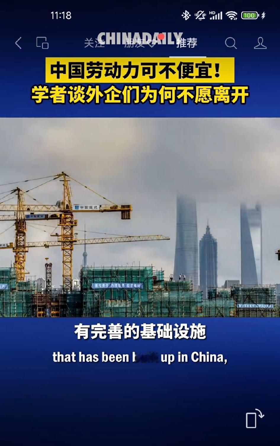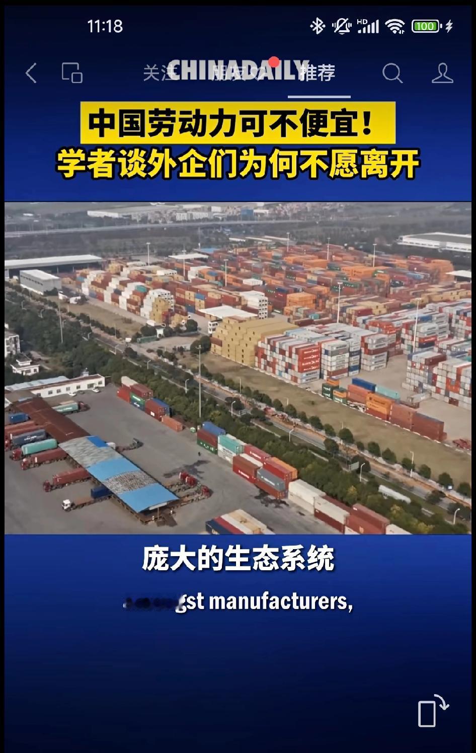 中国劳动力可不便宜!学者谈外企为什么不愿意离开中国? 记者问:很多人不知道中国现在劳动力很贵,但10年前并非如此,那时中国劳动力被认为价格低廉。 学者回答:中国的劳动力并不便宜,比印尼越南贵多了,比孟加拉国以及印度很多地区也要贵。 在他们可以轻松转移至少部分供应链到其他国家的情况下,为什么那么多外国公司仍然选择留在中国? 第一,因为中国有完善的基础设施。铁路,公路等交通设施非常发达,这能促进生产活动的有效开展。 第二,是因为制造商已经建立起一个庞大的生态系统,组装厂家和零部件供应商同样如此。这使得其中任何一家公司,都很难脱离产业集群。因为距离会增加货物运输和信息沟通的相关成本。 因此,是这两个因素使得今天中国的制造业持续发力,而不是因为廉价的劳动力。