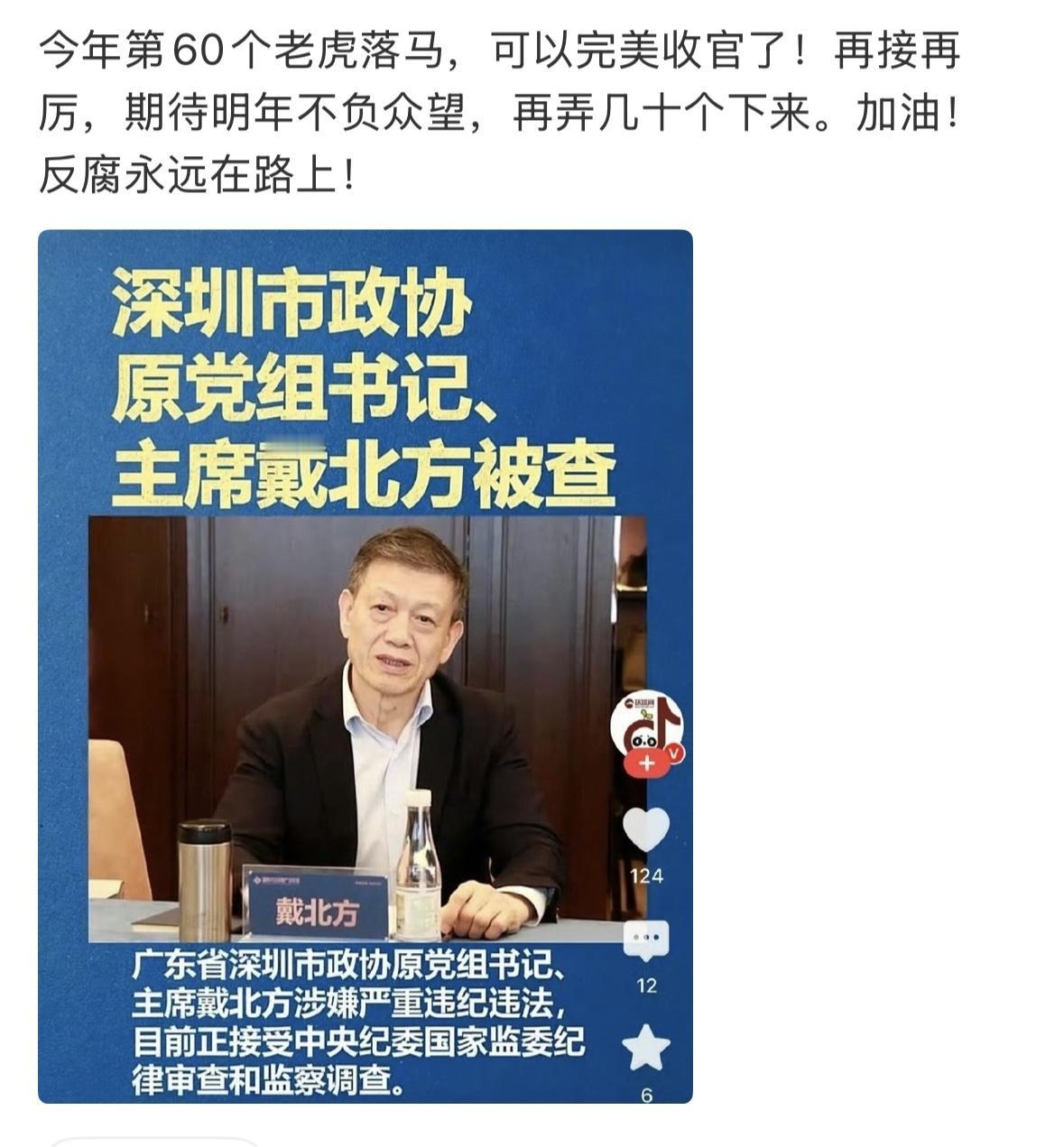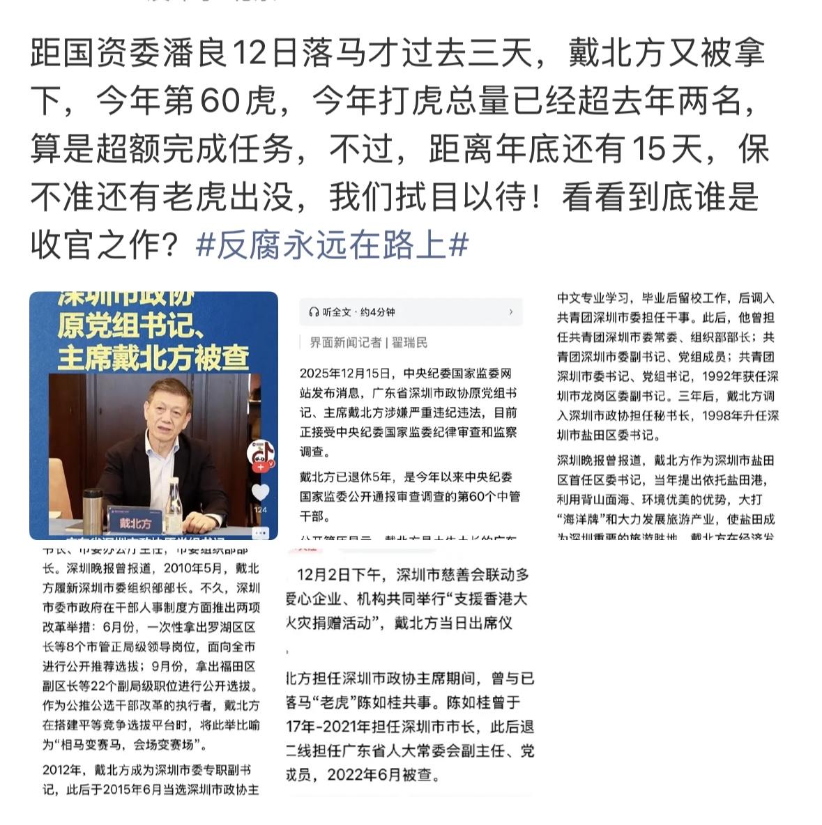 今年第61虎落马,免签看来还有戏,最近打虎保持隔两天打一虎的节奏,15日深圳得戴北方落马,12日国资委得潘良落马,节奏明显加快了,各个战斗小组,加油!