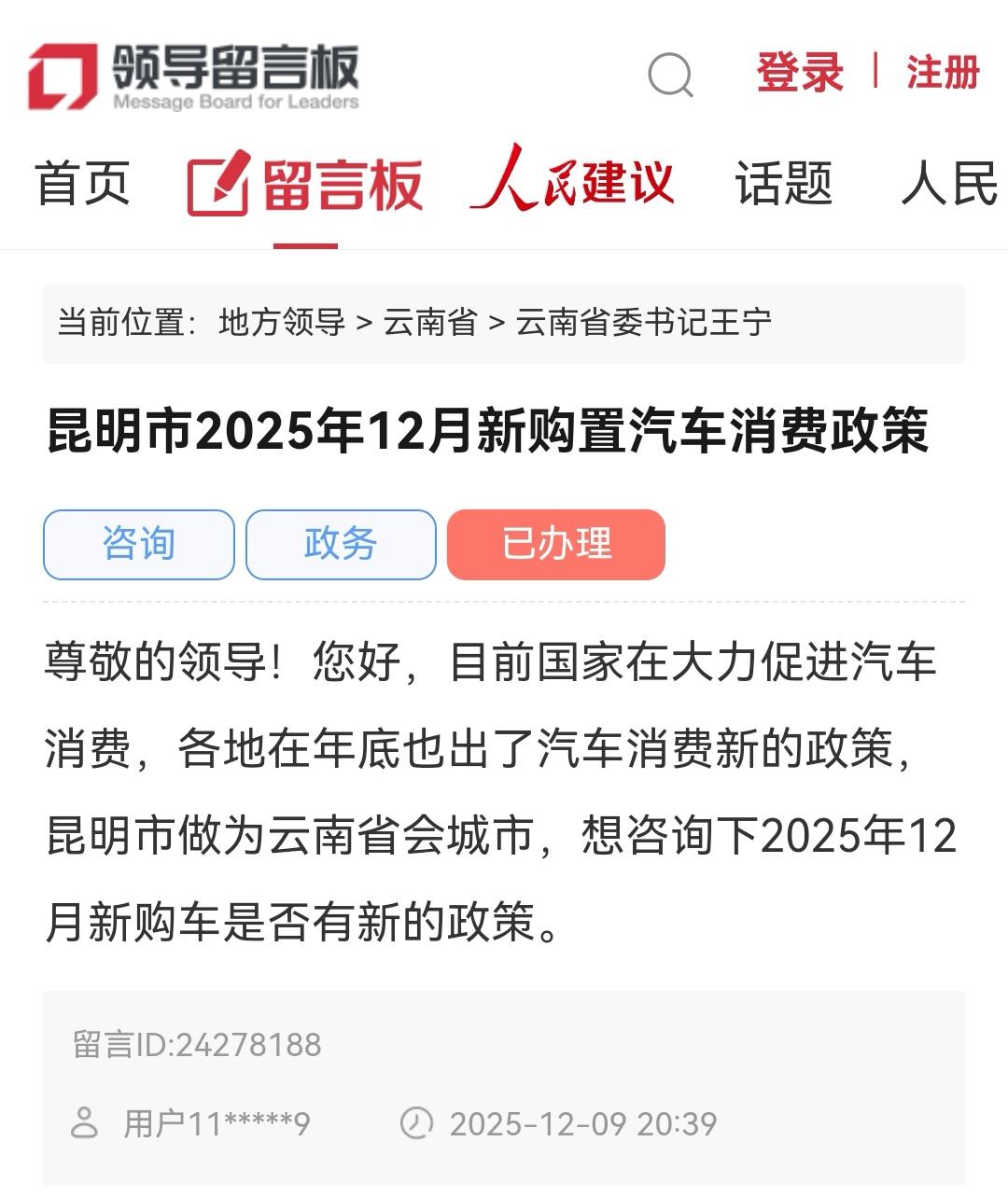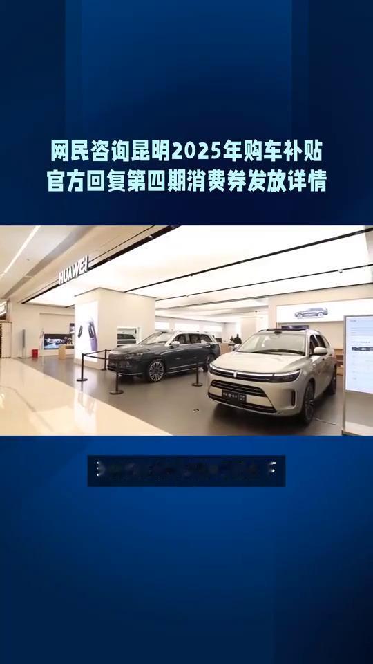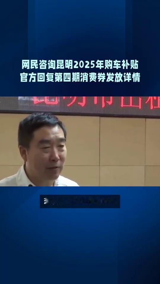 网民咨询昆明2025年购车补贴,官方回复第四期消费券发放详情。 昆明网民向省委书记咨询昆明市2025年12月新购置汽车消费政策尊敬的领导您好,目前国家在大力促进汽车消费,各地在年底也出了汽车消费新的政策。昆明市做为云南省会城市,想咨询下2025年12月新购车是否有新的政策。 2025-12-1719:00昆明市商务局官方回复网民同志您好,您通过人民网领导留言板的留言收悉,经昆明市商务局核查处理,现将有关情况回复如下:有一种叫云南的生活·彩云汽车消费券发放活动已于2025年12月13日07:00:00开始,活动具体规则可自行在昆明市商务局微信公众号搜索查看。 感谢您的关注,祝您身体健康、生活愉快!