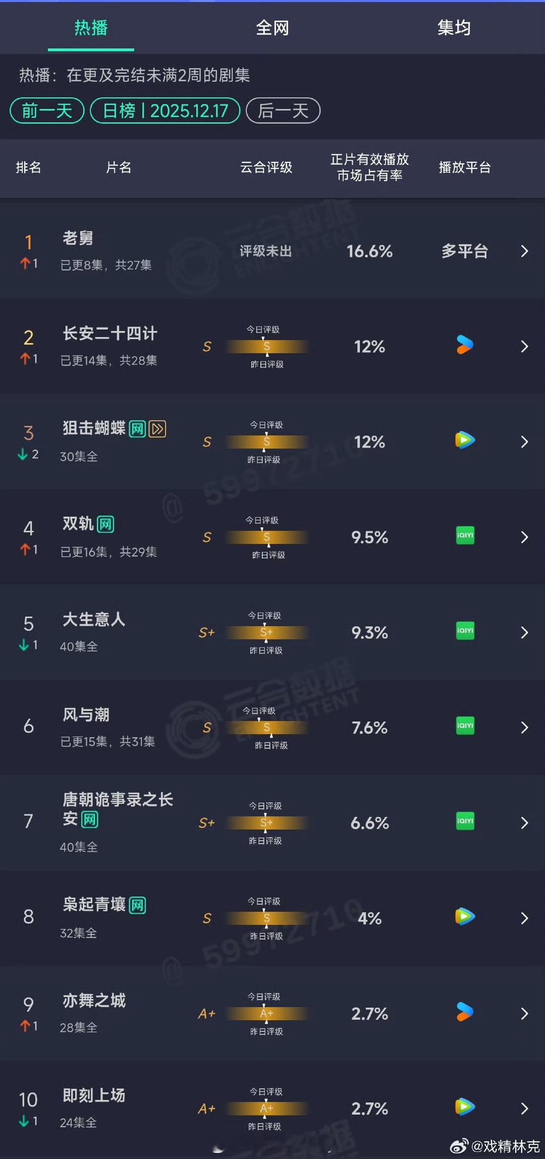 12.17云合:老舅16.6%直接登顶,郭京飞这个号召力