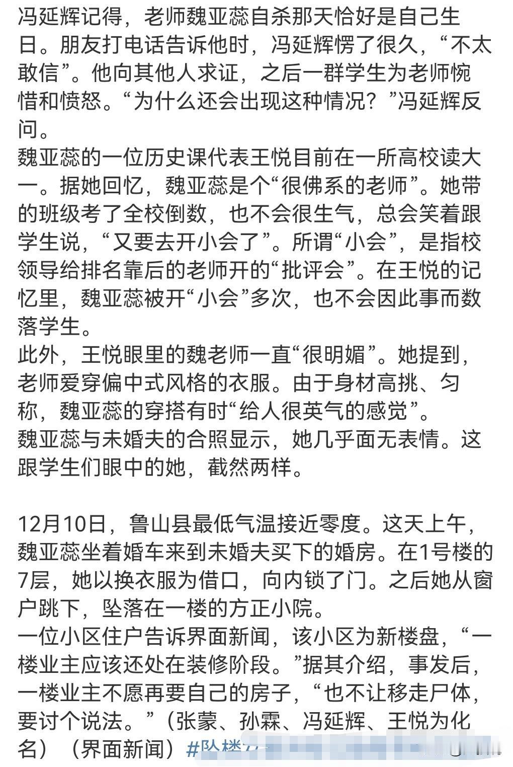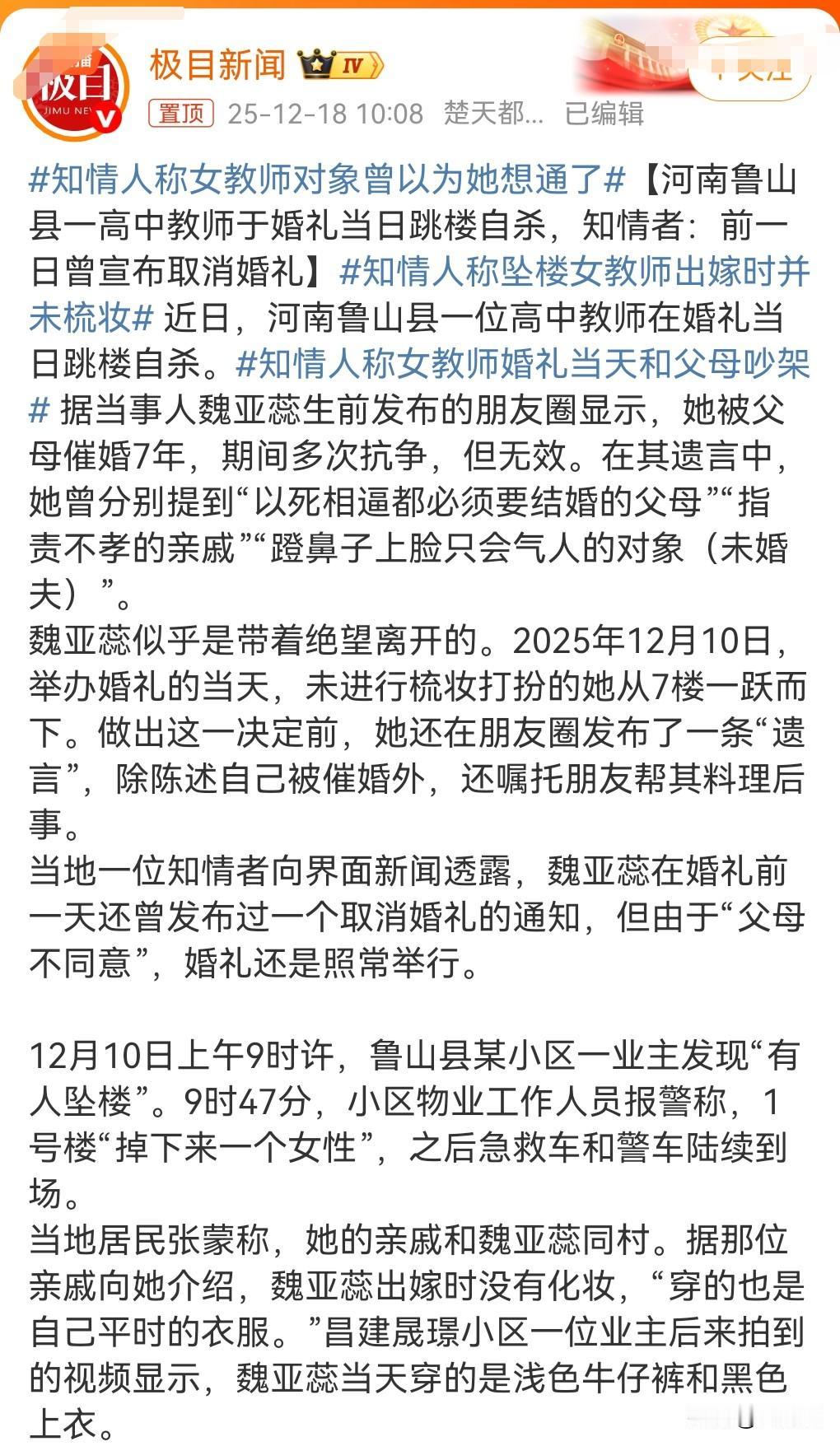 一个女教师被父母逼婚,被亲戚指责不孝,还有蹬鼻子上脸只会气人的未婚夫。 没想到她竟然选择了轻生。 这真是太悲剧了。 如果可以重来,父母肯定不会再逼她结婚了。 有些事看来真是不能勉强。 如果嫁给一个不喜欢的人,不想结婚,父母那就真的不要逼着结婚。