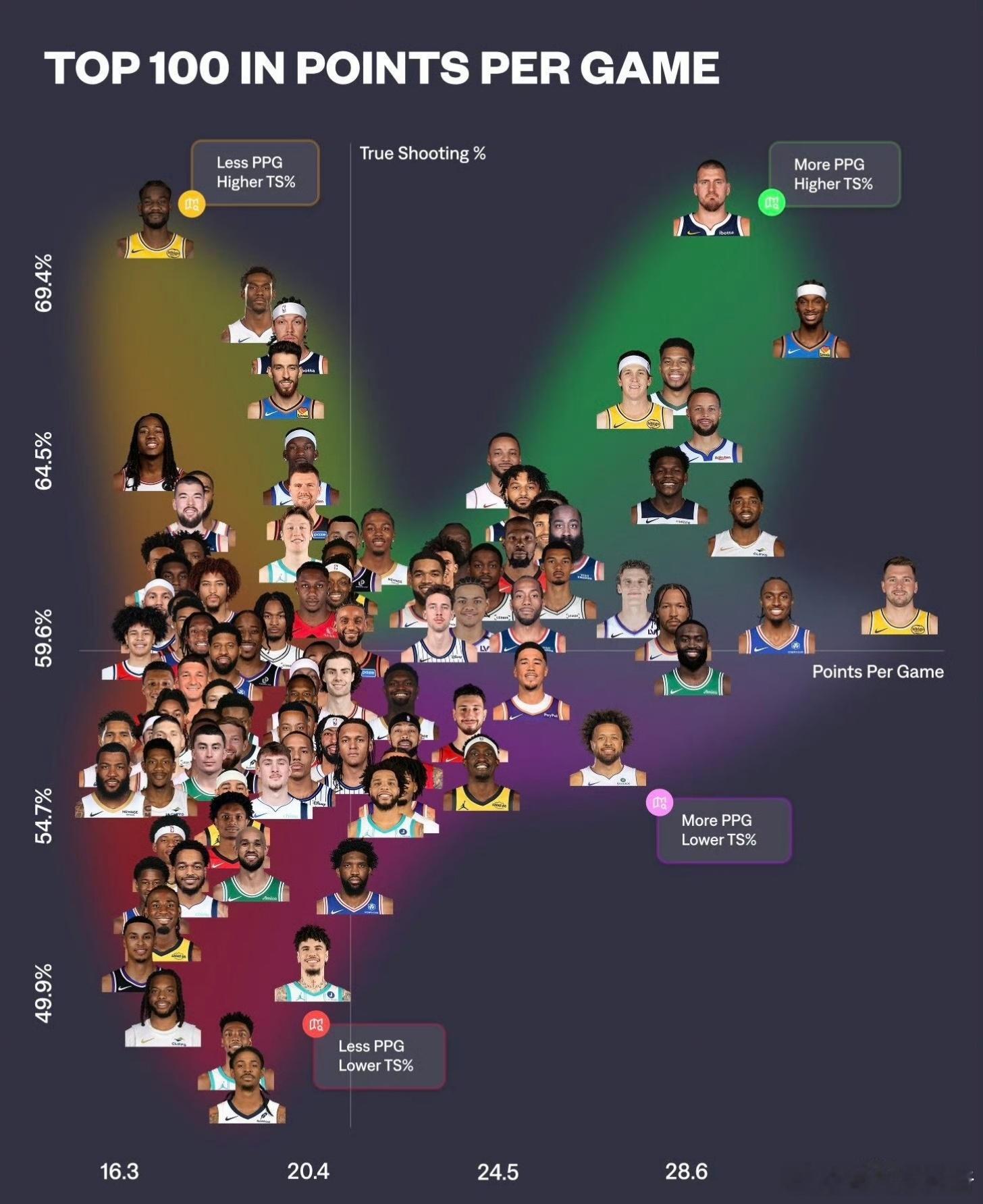 本赛季至今,场均得分前100名(至少出战10场比赛)的球员中,得分与效率对比图如下:横轴代表场均得分,纵轴代表真实命中率。100名球员中,东契奇场均得分最高;约基奇真实命中率最高,其次为艾顿;莫兰特真实命中率最低东契奇