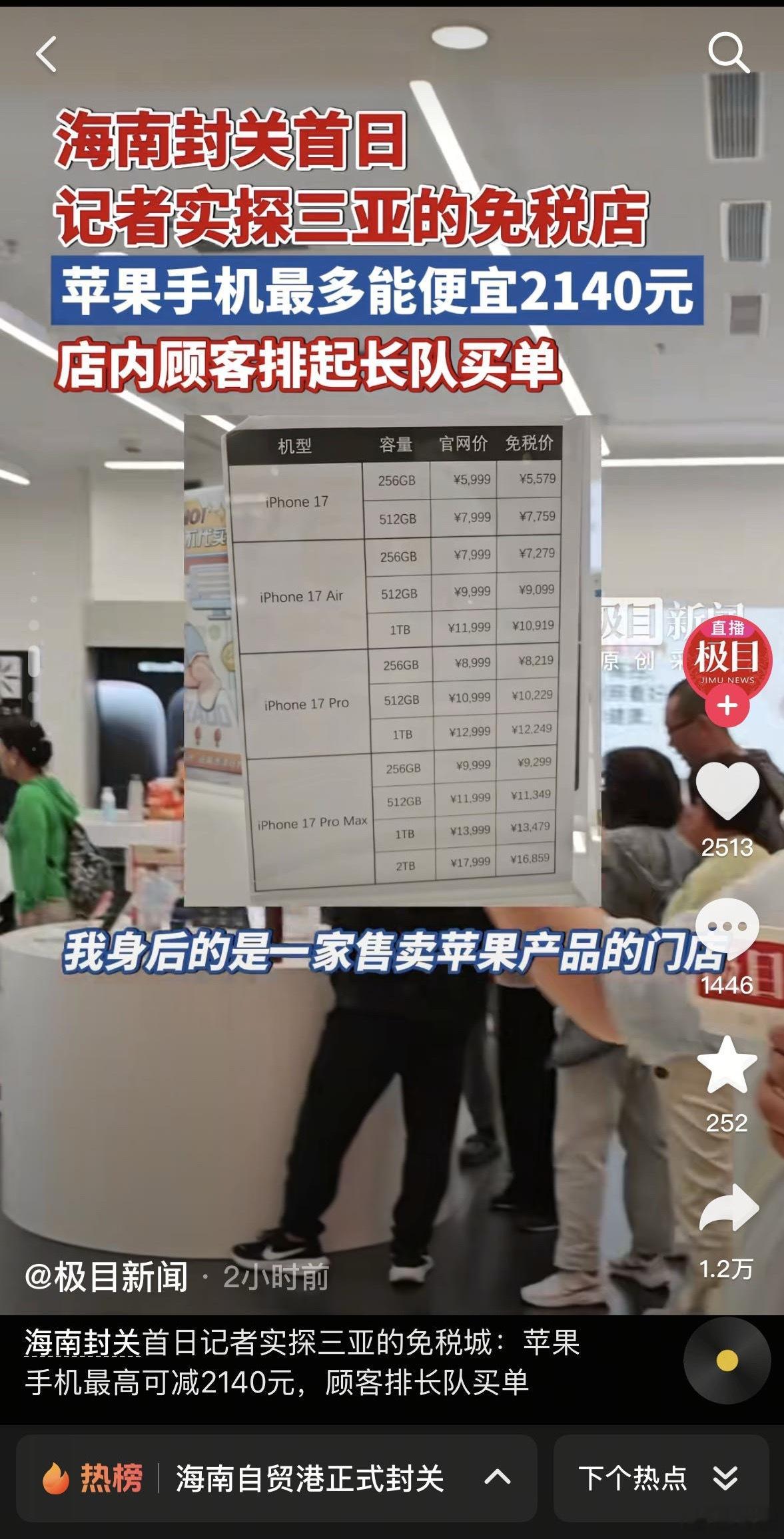 海南封关首日iPhone最高可减2140元iPhone 17 Pro Max 2TB官网价格是18000元,海南免税价格为16859元,还能叠加1000元的消费券,里外里便宜了2140!在海南买iPhone四舍五入省出了往返的机票钱,有人心动了吗?