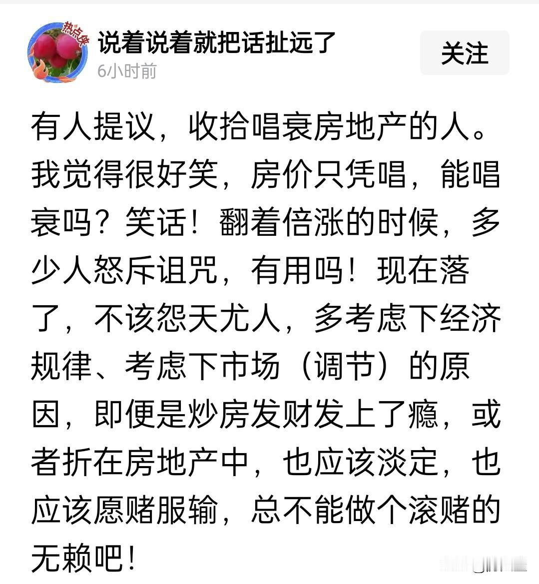 有个人说, 他对提倡收拾 唱衰房地产的人, 觉得很好笑! 其实这种人才是可笑! 并不是说房价跌是他们唱衰的, 如果这样说就是太抬举它们了, 太高看了 他们哪里有那么大的能耐啊! 清理杂音就是释放信号! 就像2017年收拾那些房吹一样, 难道那个时候的房价上涨也是他们吹上去的? 显然不是! 其实就像家里来客人, 要把那条咬人狂吠的狗拴住封嘴一样! 或者就像一个病人在恢复期 边上有人一直大喊大叫! 这药不好用! 治不好, 等死就行了! 请问病人会不会受到这种负面影响? 所以啊,唱衰者或者支持唱衰者不要想多了,因为你们没那么的的影响力, 这只是一个房价企稳回升的一个信号, 这之前需要把这些个杂音清除掉而已!
