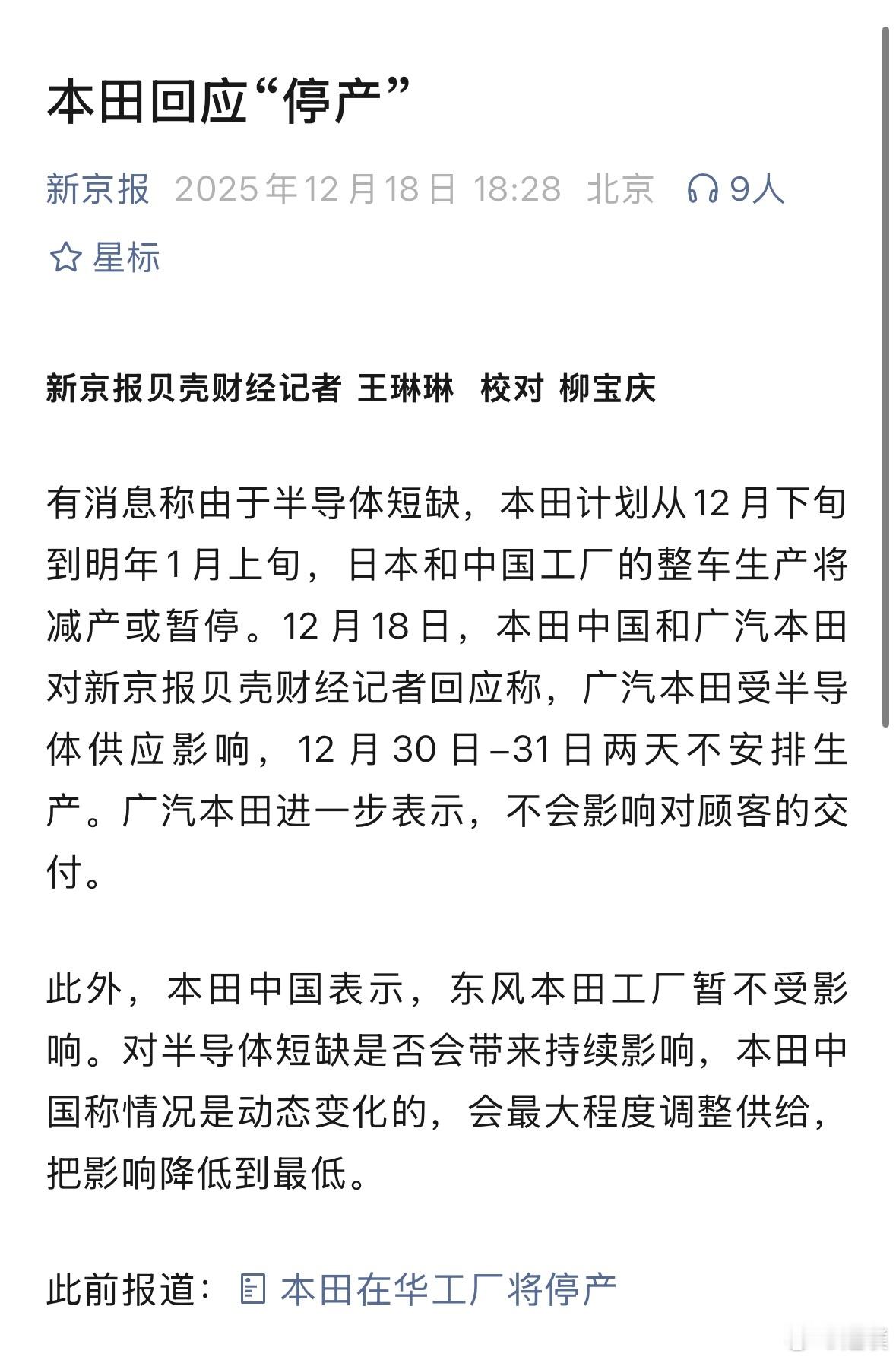 本田工厂计划从12月下旬到明年1月上旬,日本和中国工厂的整车生产将减产或暂停,停产原因是半导体短缺。本田中国工厂将停产