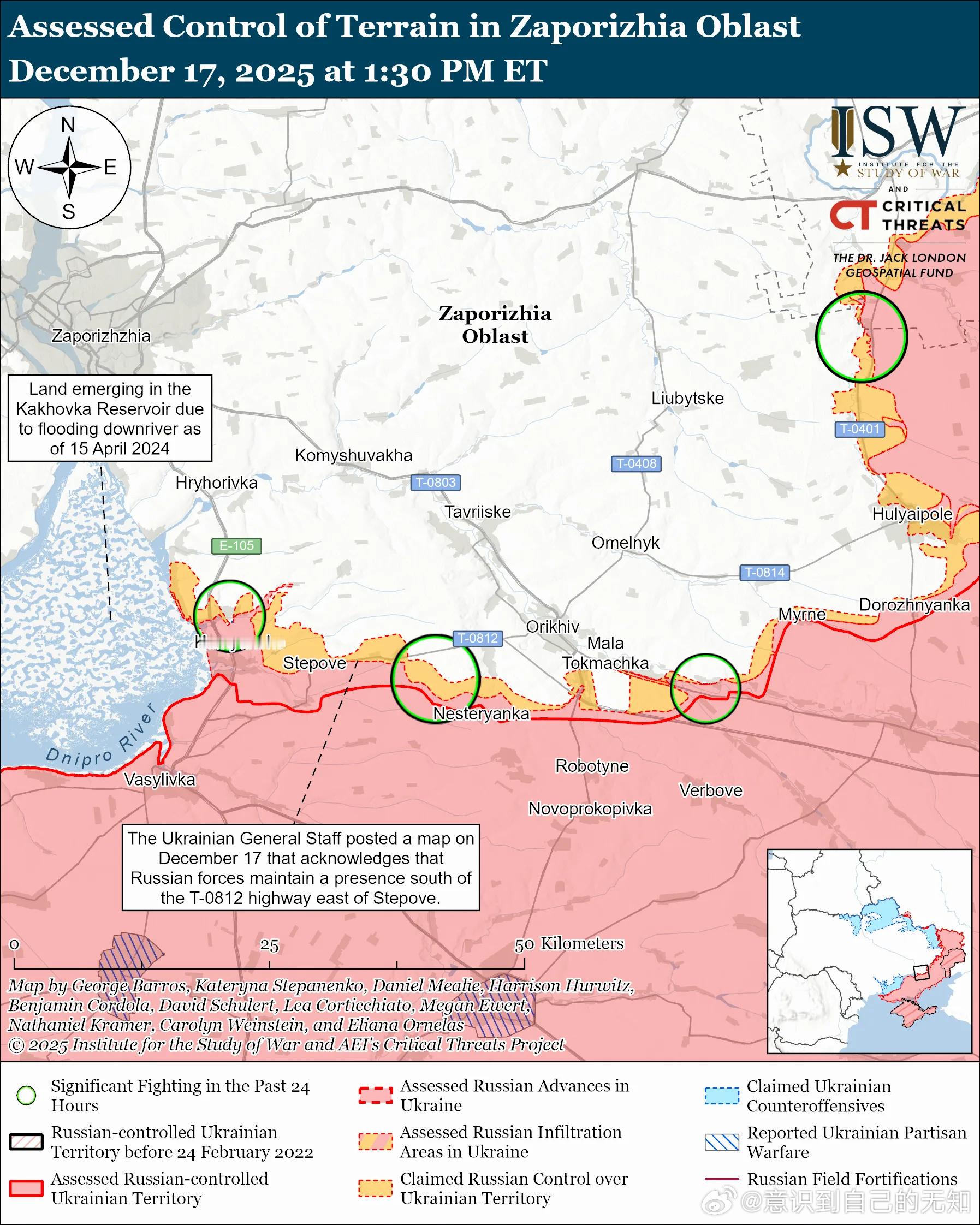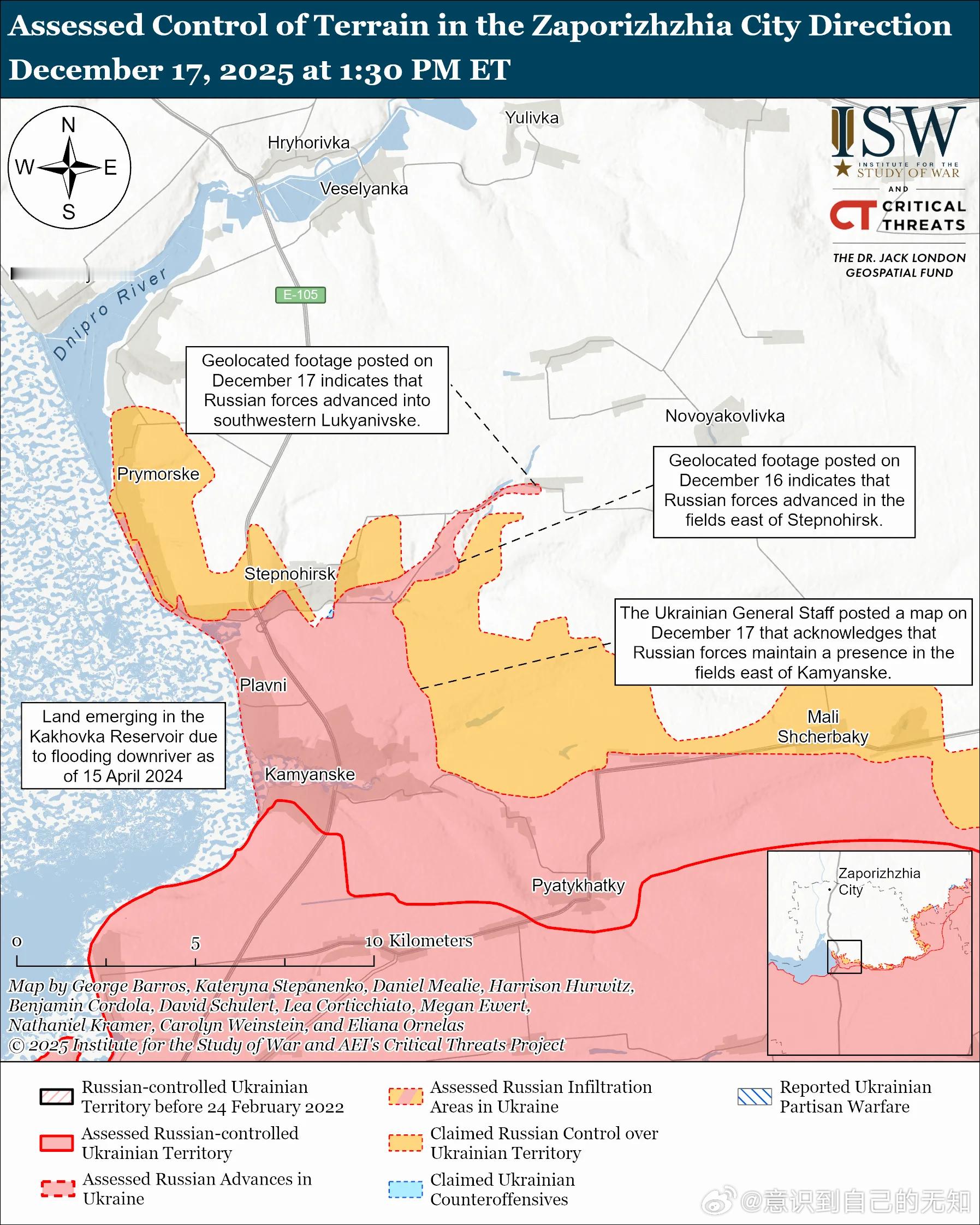 南方轴心俄军目标:守住前线阵地,确保后方免受乌克兰军队袭击,并推进至扎波罗热市的火炮射程之内。12月17日俄军继续向胡利亚波列方向发起进攻,但并未取得确切进展。未经证实的说法:俄罗斯国防部于 12 月 17 日声称,俄军占领了赫拉西米夫卡(位于胡利亚伊波列西北部)。俄方称,占领赫拉西米夫卡的是俄第 36 摩步旅(第 29 合成集团军,东部军区)。一位俄罗斯军事博主也声称,俄军向赫拉西米夫卡西南方向推进。12月16日和17日俄军在胡利亚伊波列附近及城内发动进攻;在胡利亚伊波列西北部,靠近奥斯塔皮夫斯克和多布罗皮利亚,以及布拉茨克和安德里夫卡方向;在胡利亚伊波列北部,靠近索洛德克和兹拉霍达;以及在胡利亚伊波列东北部,靠近普里维尔内和雷布内。俄罗斯军事博客声称,乌克兰军队在胡利亚伊波列进行了反击。乌克兰南方防卫军发言人弗拉迪斯拉夫·沃洛申上校于 12 月 17 日报告称,俄军继续利用恶劣的天气条件向胡利亚伊波列方向推进,并承认在胡利亚伊波列东北部和东部郊区存在少量俄罗斯渗透小组。沃洛申指出,俄军仅使用这些装备进行后勤保障,而不是进行攻击。作战序列:据报道俄第 60 和第 57 独立摩步旅(第 5 集团军、EMD)的无人机操作员正在胡利亚波列及其周边地区打击乌克兰军队。俄军最近在扎波罗热州西部取得了进展。评估俄军推进情况:12 月 16 日和 17 日发布的地理定位视频显示,俄军向斯捷普诺戈尔斯克(奥里希夫以西)以东和卢基扬诺夫斯克(奥里希夫西北部)西部推进。乌克兰总参谋部于 12 月 17 日发布了一张地图,显示俄军向斯捷波韦和卡缅斯克(均位于奥里希夫以西)以东推进。俄军于 12 月 16 日至 17 日袭击了奥里希夫东南部附近的 Mala Tokmachka 以及奥里希夫以西附近的 Novoandriivka、Shcherbaky、Stepove、Plavni、Stepnohirsk、Prymorske 和 Lukyanivske。12 月 16 日发布的地理定位视频显示,俄军在扎波罗热市西部距离前线 30 多公里处进行了“柳叶刀”巡飞弹袭击。12 月 17 日,乌克兰国家警察和扎波罗热州军事管理局局长伊万·费多罗夫报告称,俄军对扎波罗热市的居民楼和民用基础设施进行了制导滑翔炸弹袭击,造成 29 名平民受伤,其中包括 5 名儿童。作战序列:据报道俄第4军事基地(第58集团军,南部军区)的无人机操作员和“凤凰”无人机机组(可能是巴尔斯-萨尔马特无人系统特种用途中心[前身为巴尔斯-萨尔马特分遣队,隶属于空降部队]的一部分)正在奥里希夫附近作战。第108空降团(第7空降师)的无人机操作员继续在扎波罗热方向作战。12月17日乌克兰和俄罗斯方面均未报告赫尔松方向有地面活动。战斗序列:据报道俄第98空降师继续向赫尔松方向作战。