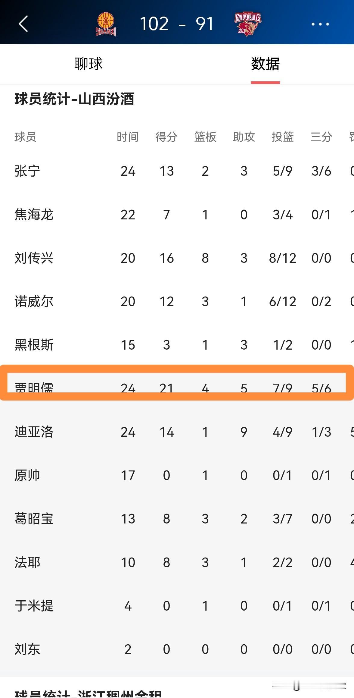 山西汾酒大将贾明儒真是大放异彩!在今天山西汾酒主场以102:91击败浙江稠州金租的比赛中,贾明儒绝对是球队能够获胜的最大功臣。全场比赛下来,贾明儒替补出战24分钟,投篮9中7,其中三分球6中5、罚球2中2非常高效的砍下21分4篮板5助攻1抢断,他的场上正负值高达+19。 值得一提的是,在关键的第四节比赛中,贾明儒成为了场上最闪耀的球员。