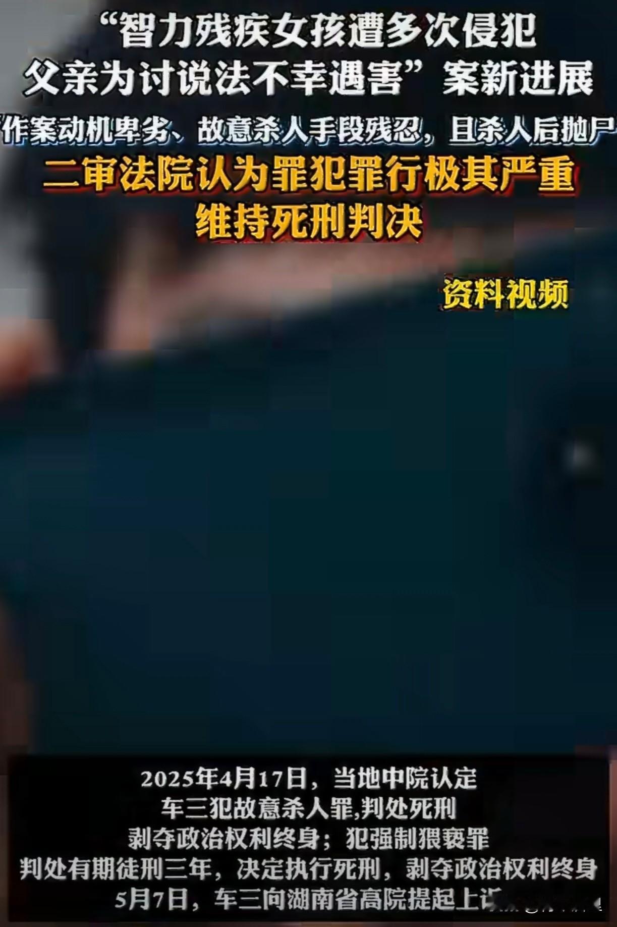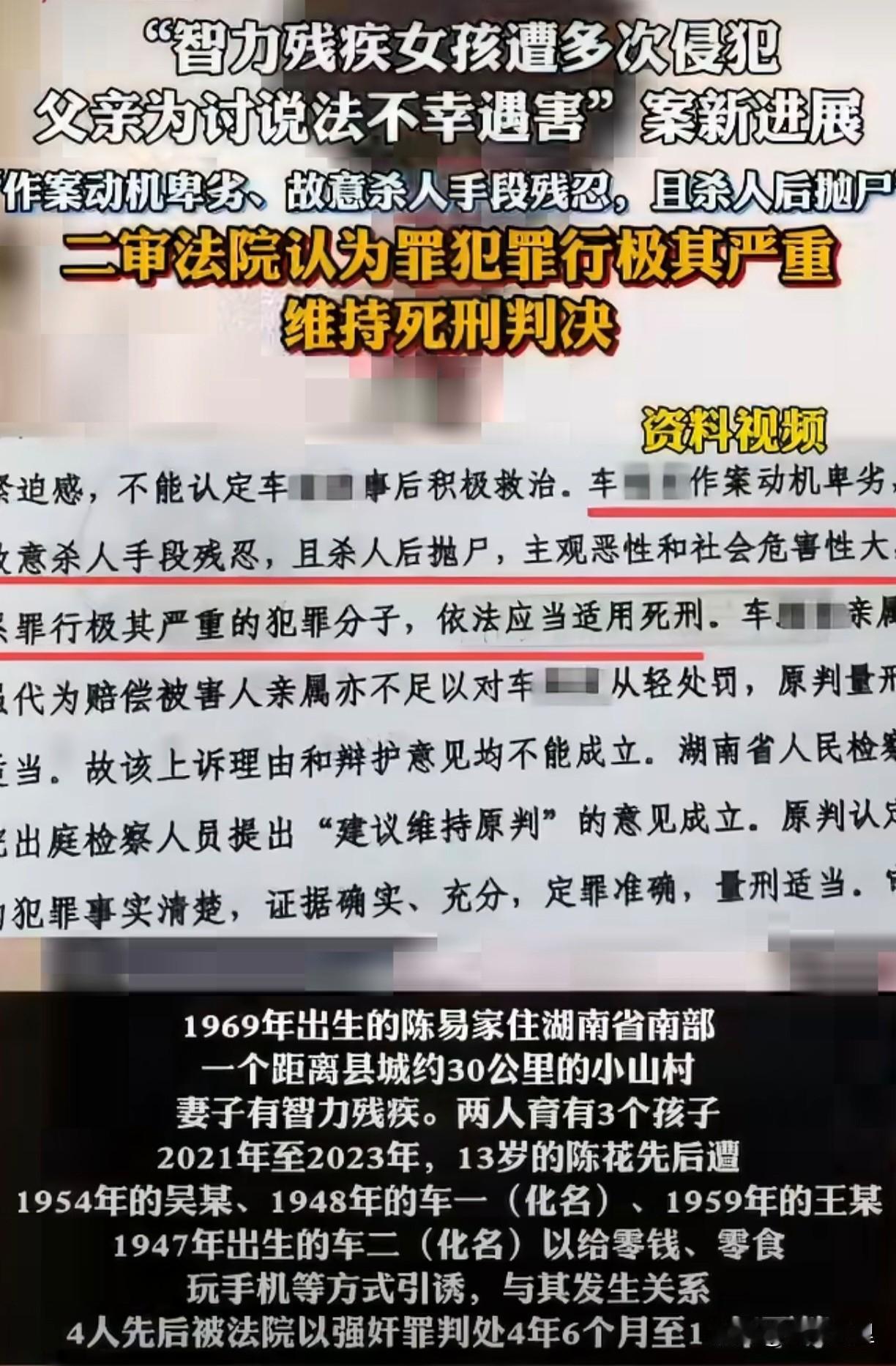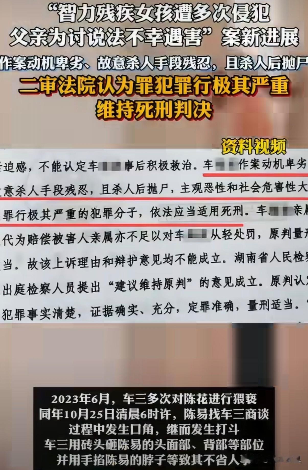 这是我听过最惨烈的“讨要说法”了。 湖南一智力残疾女孩遭到侵犯,她父亲找上门去理论,只是想为自己的女儿讨个公道,结果竟被凶手害死。时隔近三年,法律终于给了他们一份公道,维持死刑。 真是有够坏的,欺负残疾女孩,已经够缺德了,还敢对女孩的父亲下毒手。得亏法律还有底线,这要是让这种人逃脱了,那就真没天理了。